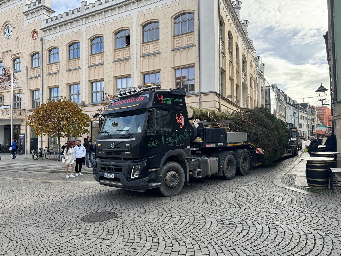 Die Fichte ist mit ihren gut 20 Metern der höchste Baum seit Jahren. In den nächsten Tagen werden Hunderte Leuchten angebracht. Eröffnet wird der Weihnachtsmarkt am 24. November.
