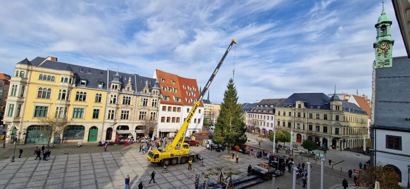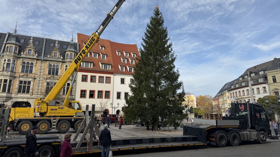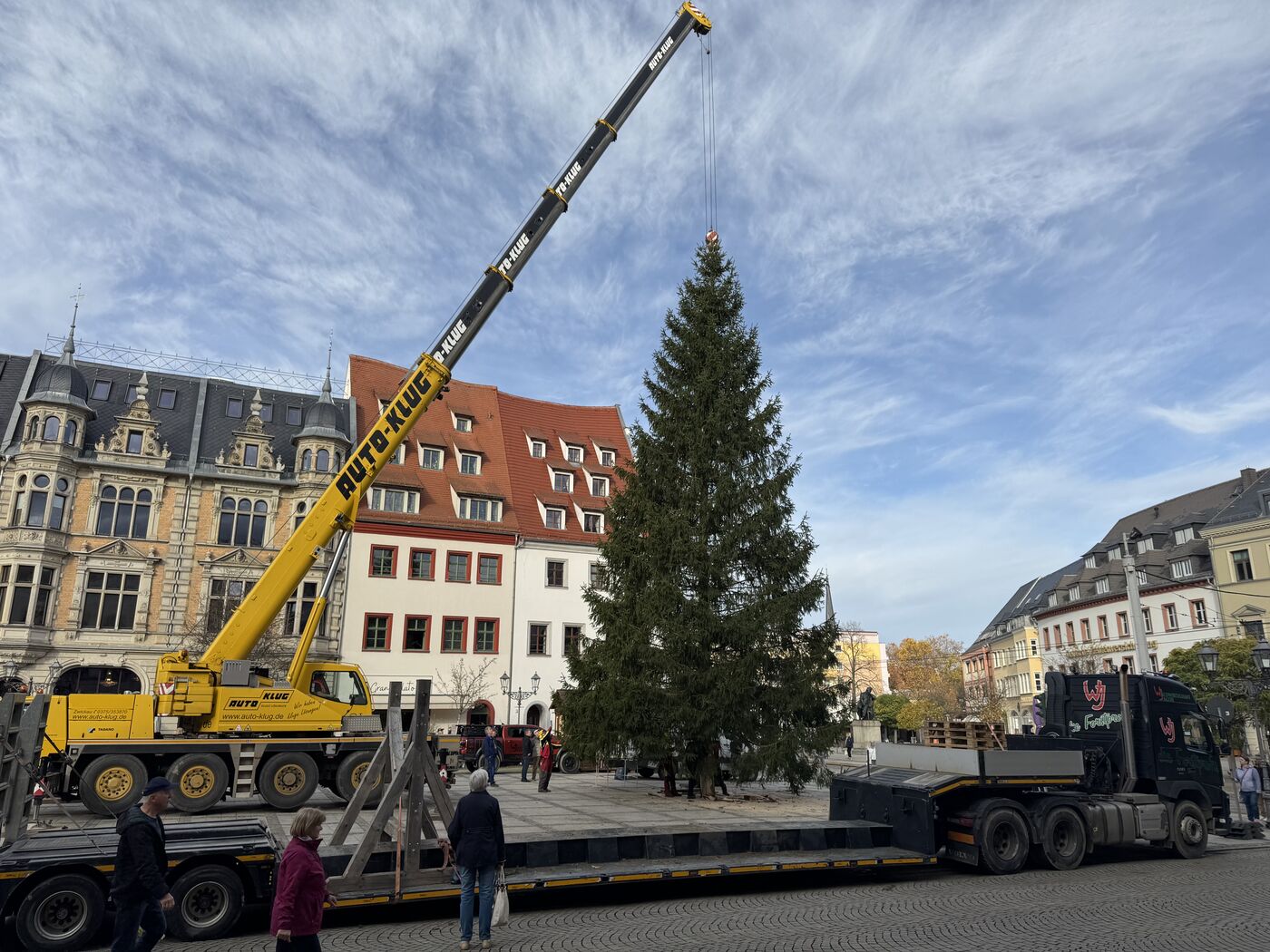 20-Meter-Fichte schmückt Zwickauer Weihnachtsmarkt