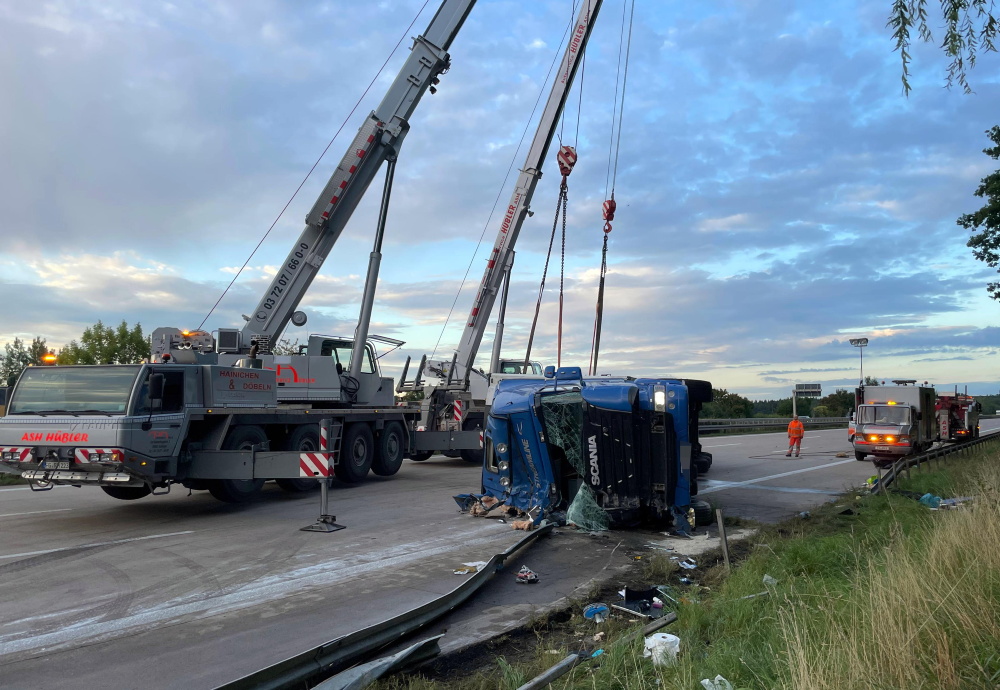 Bei dem Unfall war ein polnischer Laster gegen 1 Uhr aus bislang ungeklärter Ursache in die Leitplanke geraten und umgestürzt. Der LKW hatte abgepackte Klebemittel geladen. Er kam entgegen der Fahrtrichtung zum Liegen. Der ukrainische Fahrer - 55 Jahre alt - blieb unverletzt.