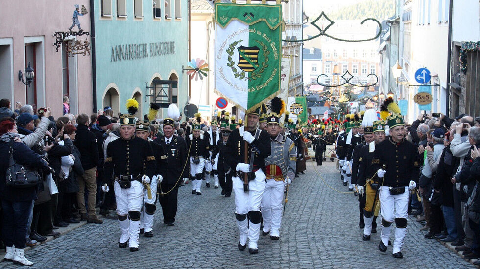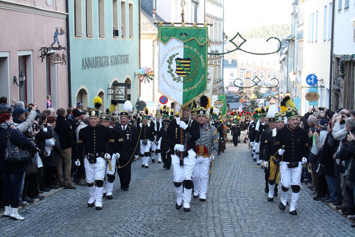 In Annaberg steht am vierten Advent die größte Bergparade in der Weihnachtszeit an. Über 900 Trachtenträger und 250 Bergmusiker werden aufmarschieren. Start ist 13:30 Uhr am Wolkensteiner Tor. Von dort geht es zum Markt und die Buchholzer Straße entlang, die große Kirchgasse hinauf zur St. Annenkirche, wo es das große Abschlusszeremoniell und ein Konzert der Bergmusiker geben wird. Parkmöglichkeiten gibt es auf dem Kätplatz, an der Feldschlösschenkreuzung und an der Wolkensteiner Straße. In der Innenstadt sind viele Straßen ab/seit 10 Uhr gesperrt.