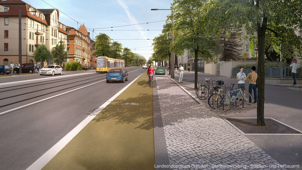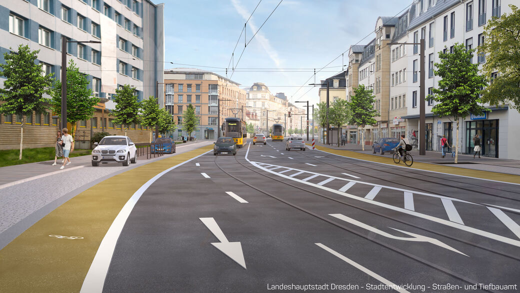 Zunächst verschwinden die Pflastersteine – dadurch wird es künftig deutlich leiser. Außerdem entstehen auf beiden Straßenseiten neue Radwege. Auch Gehwege und Haltestellen werden komplett erneuert. Die Straßenbahnschienen werden weiter auseinandergezogen, damit künftig auch die breiteren Bahnen der Dresdner Verkehrsbetriebe (DVB) auf der Strecke fahren können.