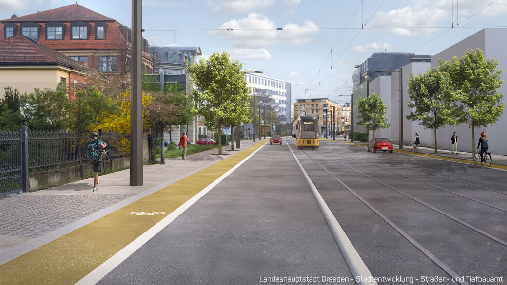 Nicht immer: Zwischen Albertplatz und Katharinenstraße haben die Straßenbahnen eine eigene Spur. Im Abschnitt zwischen Katharinenstraße und dem Bischofsweg nutzen Straßenbahnen und Autos dann gemeinsam die Fahrbahn, im Bereich zwischen Bischofsweg und Stauffenbergallee werden die Bahnen wieder vom Kfz-Verkehr getrennt.
