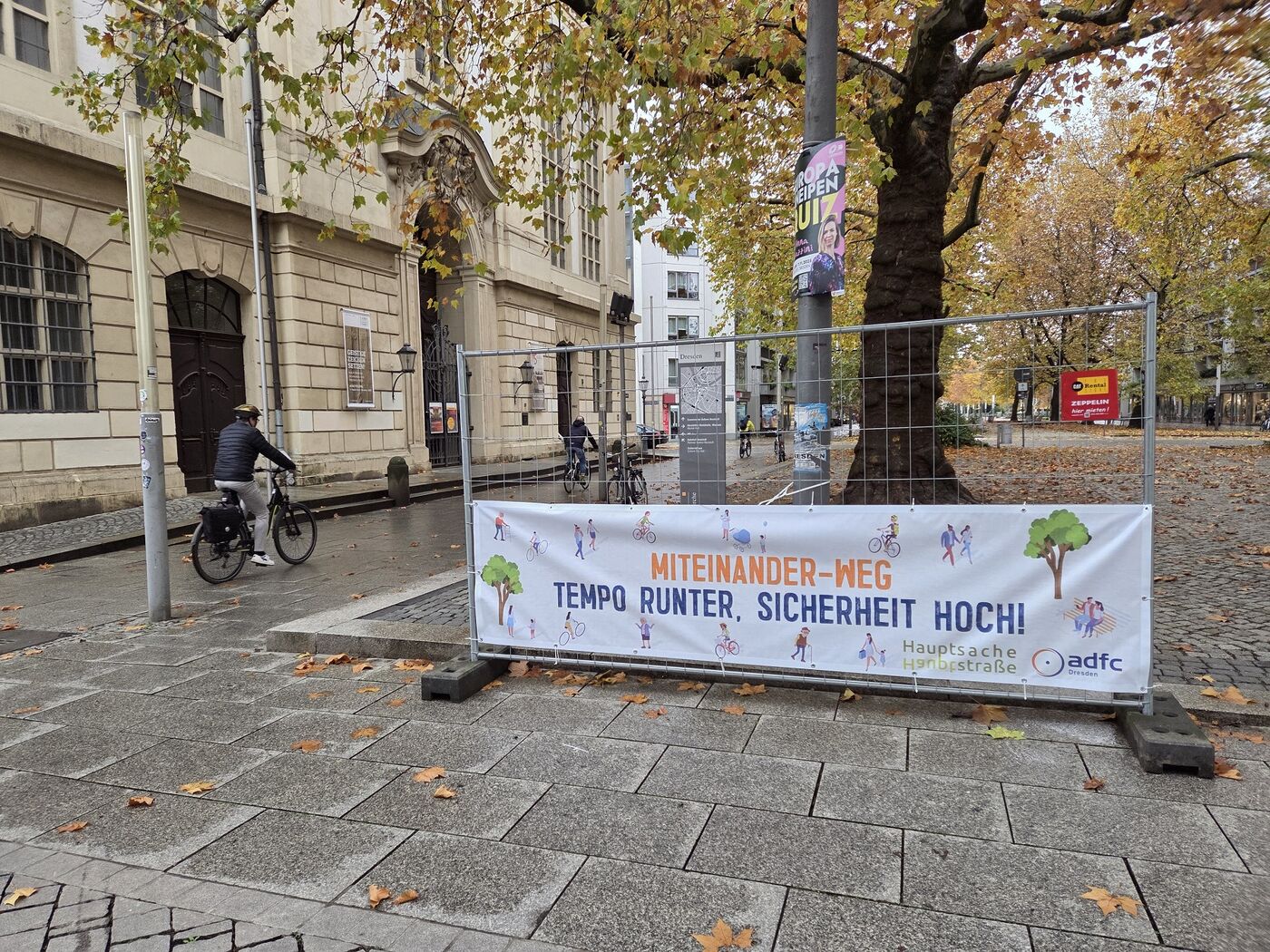 Mit einem Plakat mahnt der ADFC Dresden alle Radfahrer auf der Hauptstraße zu Rücksicht und einem gefahrlosen Miteinander. Gleichzeitig unterbreitet der Fahrradclub Vorschläge zur Verbesserung der sogenannten Augustus-Route.