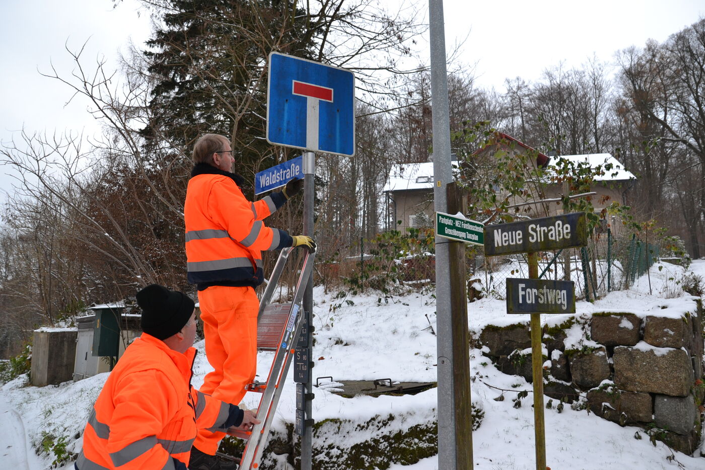 - Mitarbeiter der Stadt Sebnitz montieren gerade die neuen Straßenschilder an fast 30 Straßen. Die alten bleiben parallel bis Ende Januar hängen