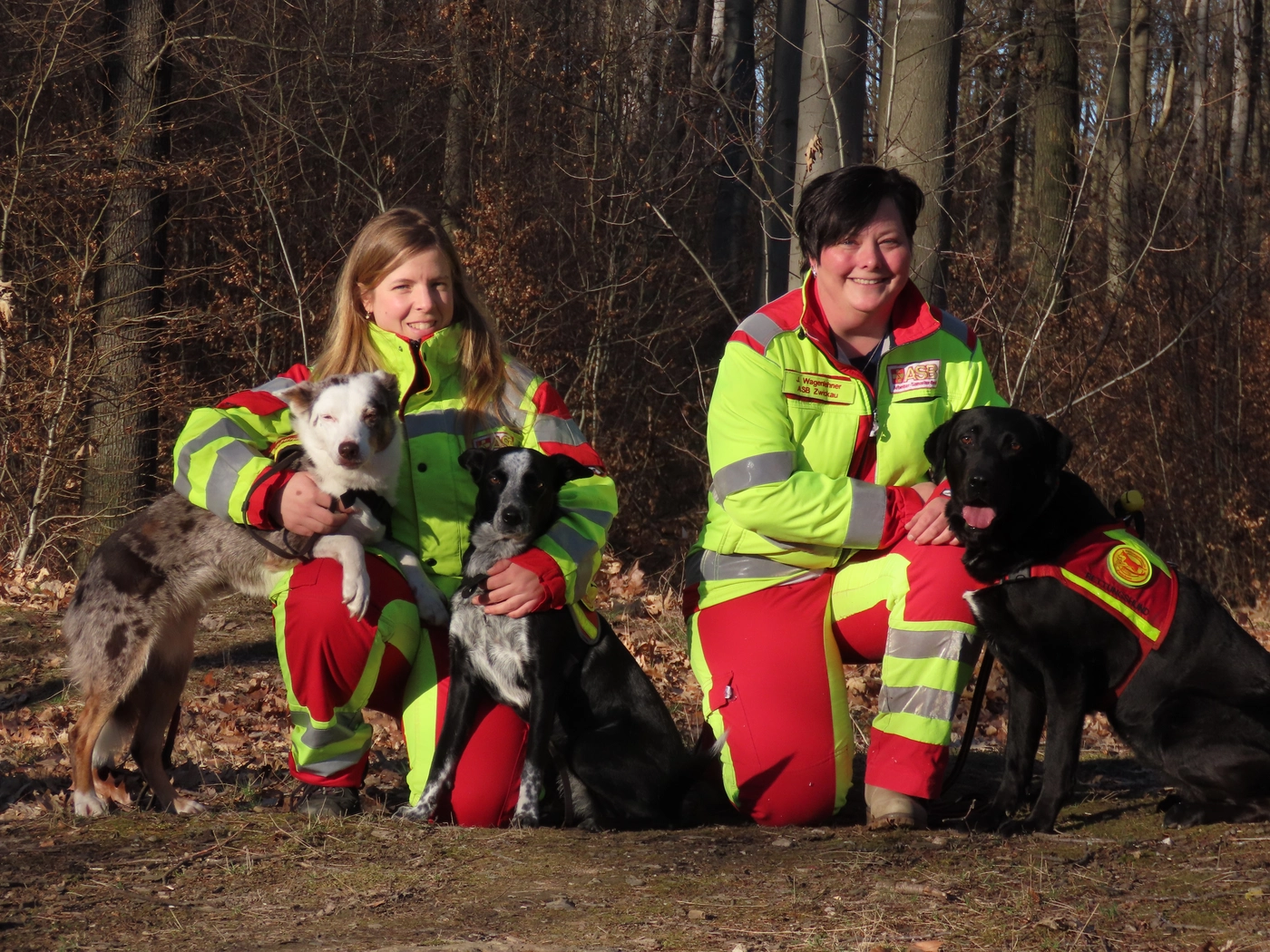 - Jana Wagenlehner (l.) und Caro Deppler von der ASB-Rettungshundestaffel aus Zwickau gemeinsam mit ihren tierischen Einsatzkräften.