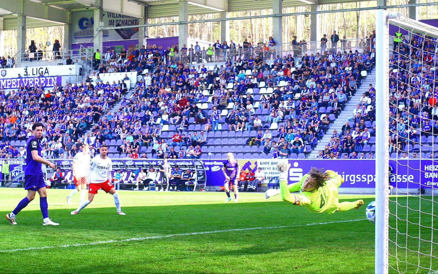 Nach der Gelb-Roten Karte wegen Meckerns von Al Gaddioui hatte Aue zahlreiche Chancen und konnte diese schließlich in der 63. Minute nutzen. Jakob traf nach einem Traumschuss aus dem Rückraum zum 1:0. Nach einem Freistoß von Ryan Johansson schafften es die in Unterzahl spielenden Gäste tatsächlich, auszugleichen. Manzambi traf per Kopf zum 1:1. Die Veilchen ließen sich nicht schocken und es dauerte nur wenige Minuten, bis Stefaniak den Siegtreffer für die Veilchen markierte (mit dpa).
