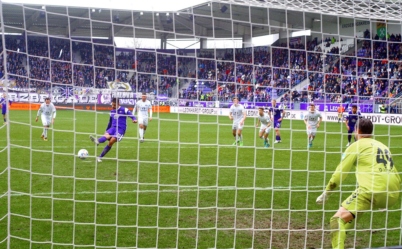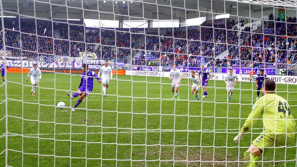 In einer spielerisch eher zerfahrenen ersten Halbzeit hatten beide Teams starke Phasen. Die der Gäste dauerte zehn Minuten und brachte durch den ehemaligen Auer Max Wegner in der 15. Minute eine gute Chance. Torhüter Martin Männel parierte aber im Nachfassen sicher. Ab der Hälfte der ersten 45 Minuten wurden die Gastgeber stärker. Mehr als eine gute Möglichkeit von Omar Sijaric (30.), der nur knapp verzog, sprang aber auch nicht heraus, da die Erzgebirger im Strafraum zu umständlich agierten. Zudem wurde aus den vielen Standardsituationen zu wenig gemacht.