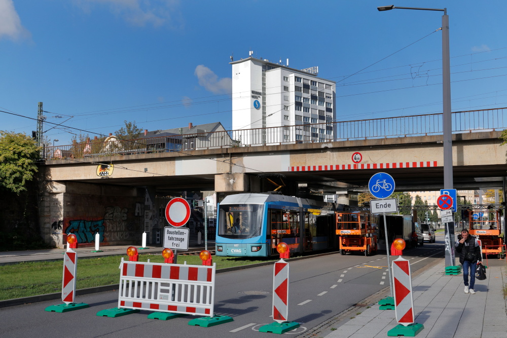An der Bahnbrücke auf der Bernsdorfer Straße laufen derzeit Prüfungen auf mögliche Schäden. Das Bauwerk stammt noch aus DDR-Zeiten. Am Montag (22. September) war dafür die stadtauswärtige Fahrspur gesperrt. Heute folgt die Sperrung der Gegenrichtung.