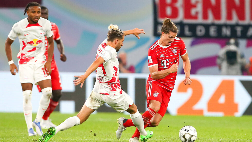 So sah de Ligt von der Bank aus ein starkes Spiel seiner neuen Mannschaft. Die Münchner waren lange Zeit giftiger, aggressiver und technisch versierter. Mit hohem Pressing bereiteten sie den Gastgebern große Probleme. So dauerte es gerade mal 14 Minuten, ehe das erste Münchner Pflichtspiel-Tor der neuen Saison fiel: Nach einer verunglückten Befreiungsaktion der Leipziger kam der Ball zu Musiala, der aus halbrechter Position einschoss. Keine gute Figur hatten zuvor Marcel Halstenberg und der von den Bayern umworbene Konrad Laimer gemacht.