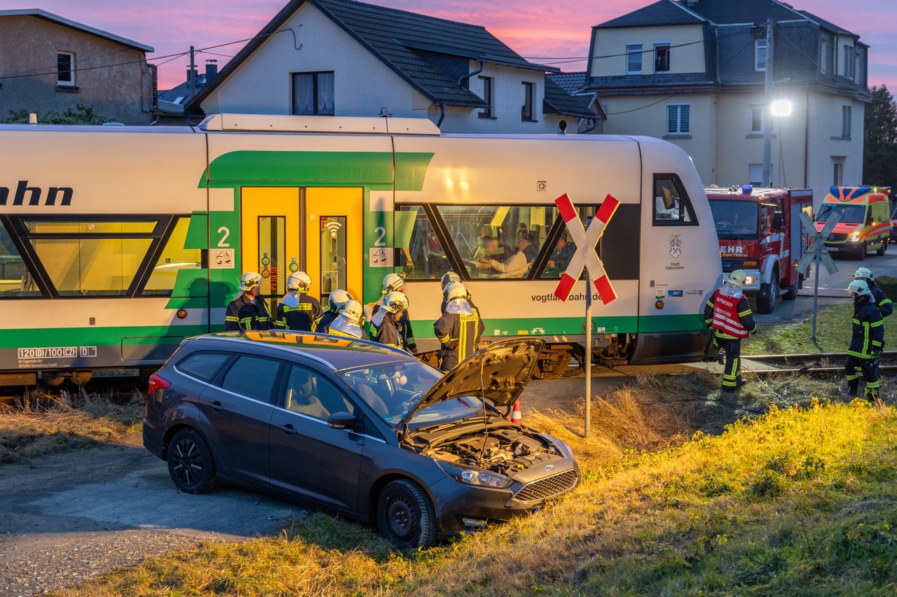 Im Auerbacher Ortsteil Rebesgrün ist ein Auto mit der Vogtlandbahn zusammenstoßen. Der Unfall Mittwochnachmittag ging noch glimpflich ab, es wurde niemand verletzt.