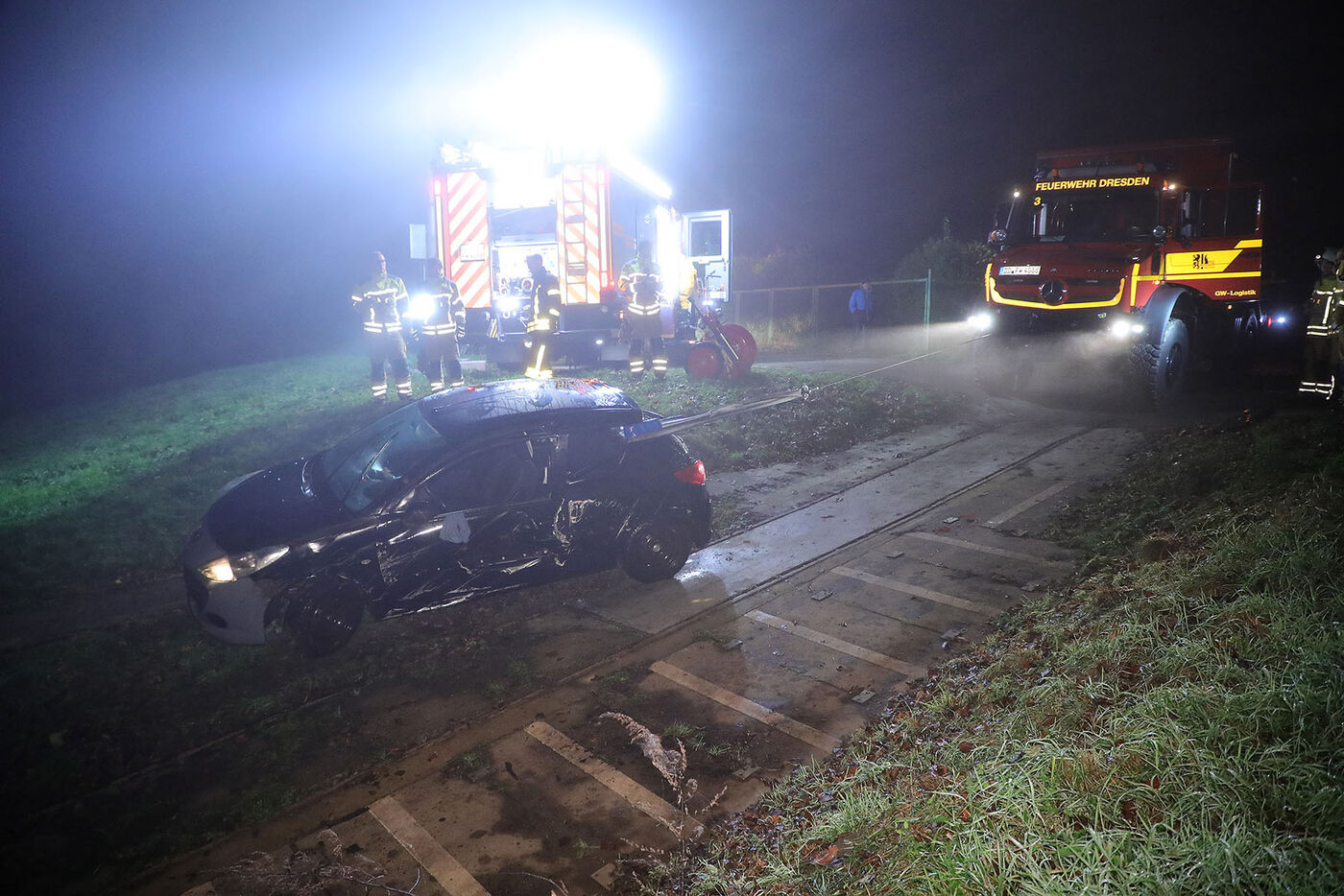 In Dresden-Zschieren hatte die Feuerwehr am Montagabend einen nassen und kalten Einsatz bei dichtem Nebel. Am Elbweg war am Bootsanleger ein Peugeot in die Elbe gerollt. Nach Informationen der Feuerwehr retteten beherzte Passantinnen den Fahrer aus dem Kleinwagen und dem kalten Elbwasser. Bei dem Fahrer handelt es sich nach Angaben der Polizei um einen 77 Jahre alten Mann
