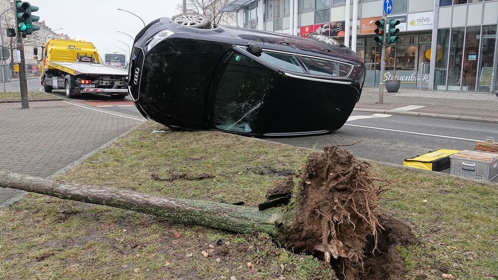 Am „Nürnberger Ei“ in Dresden ist am Freitag ein Auto ins Schleudern geraten und umgekippt. Der Audi fuhr aus noch ungeklärter Ursache auf die Mittelinsel und fällte dort ein kleines Bäumchen, dann legte es ihn auf die Seite.