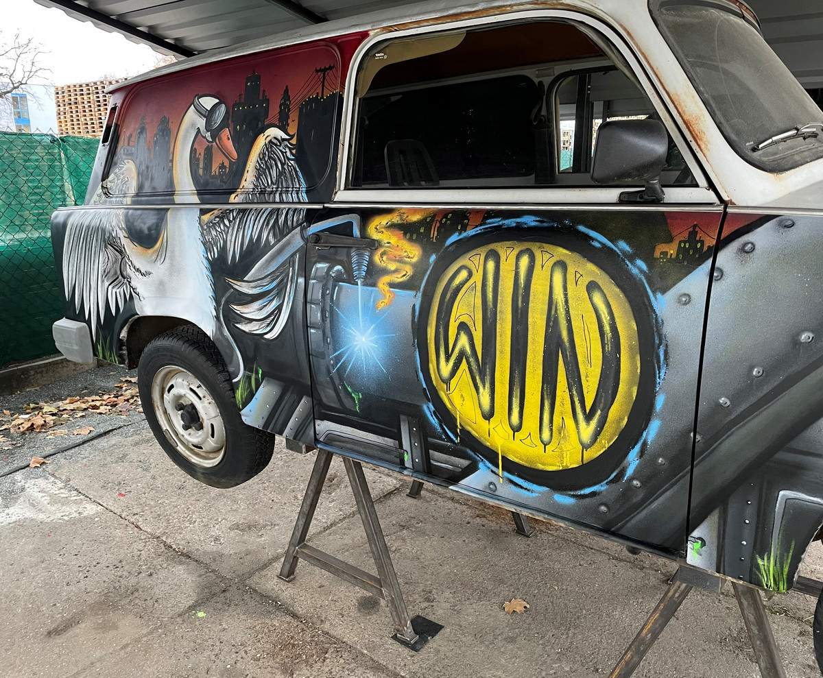 Die Firma WIN lässt gerade ihr Wahrzeichen an der Bürgerschachtstraße aufpeppen. Der Trabi ist vom Firmendach verschwunden und bekommt derzeit vom Zwickauer Graffiti-Künstler Thoralf Mader ein neues Outfit. Seine Idee hatte das Management überzeugt: Er bringt Zwickau und die Wartungs- und Instandhaltungsfirma in Verbindung, indem er das Wappentier der Stadt zum WIN-Mitarbeiter macht…
