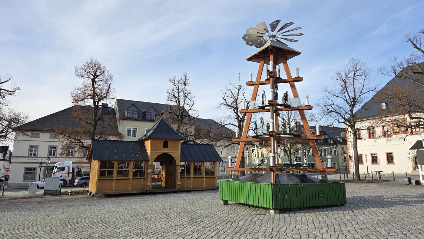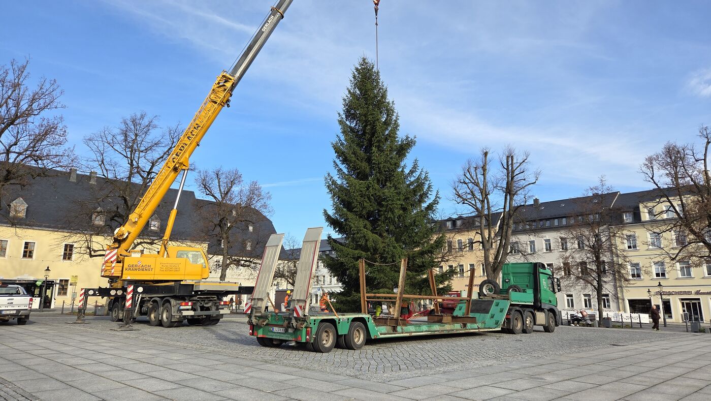 In den kommenden Tagen wird die 15 Meter hohe Fichte mit hunderten Lichtern geschmückt. Ab Freitag wird dann die Eisbahn aufgebaut und ab kommender Woche folgen die restlichen Marktbuden. Der Marienberger Weihnachtsmarkt beginnt dann am 26. November.