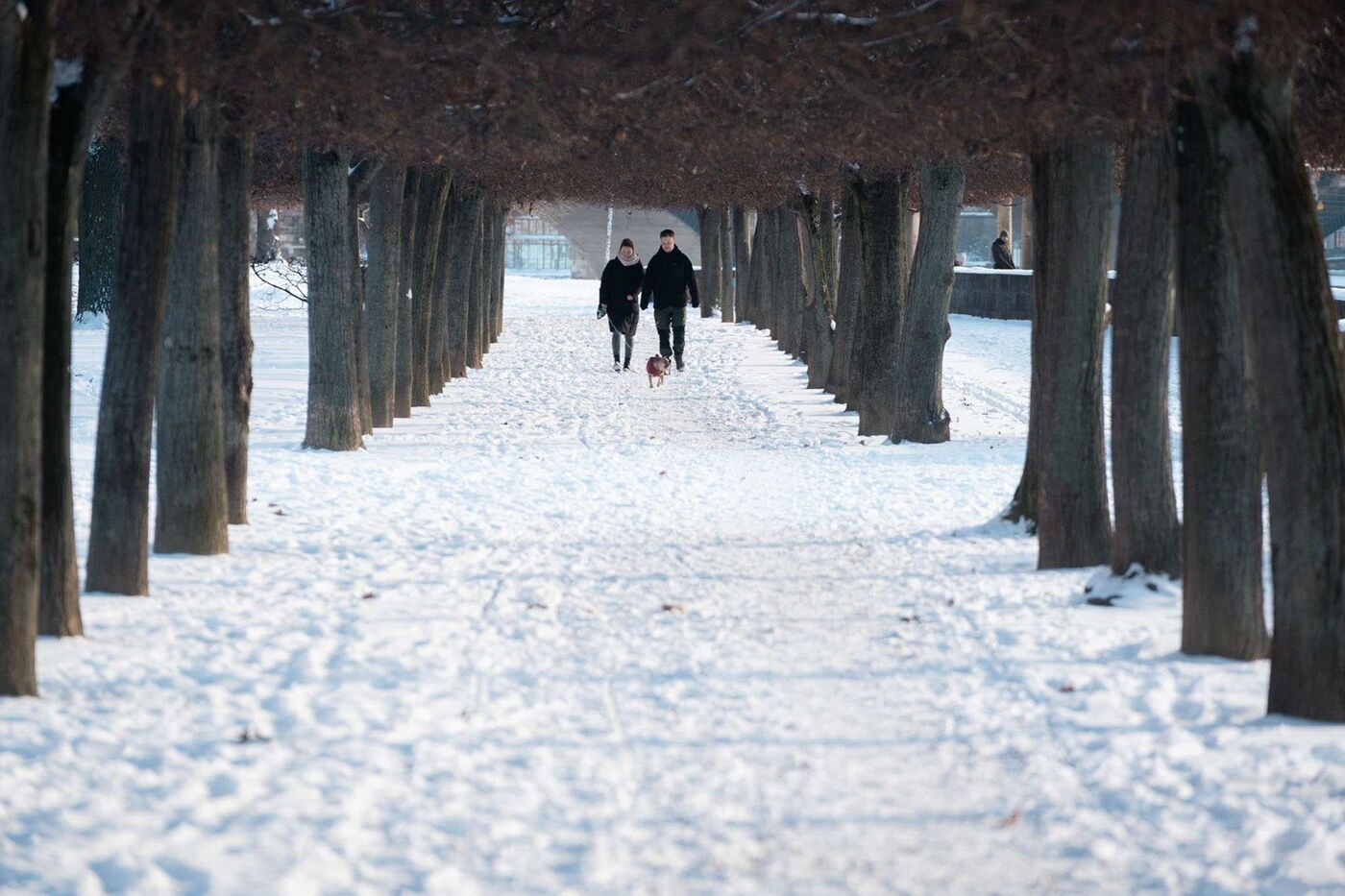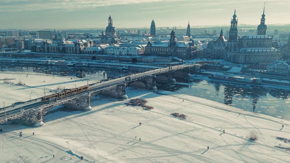 Was für eine Traumkulisse für Skifahrer! Reichlich Neuschnee hat auch die Elbwiesen vor Dresdens historischer Altstadt weiß gefärbt.