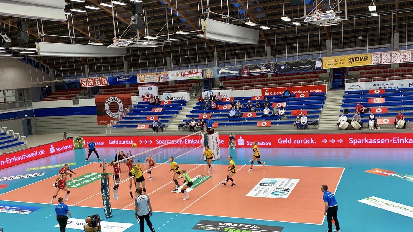 Die Gastgeberinnen starteten sehr konzentriert und zeigten sich taktisch gut eingestellt. Zudem konnte der DSC aus stabiler Annahme variabel angreifen. Im zweiten Durchgang fand Münster deutlich besser ins Spiel, lieferte den Gastgerinnen einen offenen Schlagabtausch. Doch in der Schlussphase spielten die Dresdnerinnen ihre Stärken aus und sicherten sich mit einem Aufschlagpunkt auch diesen Satz.
