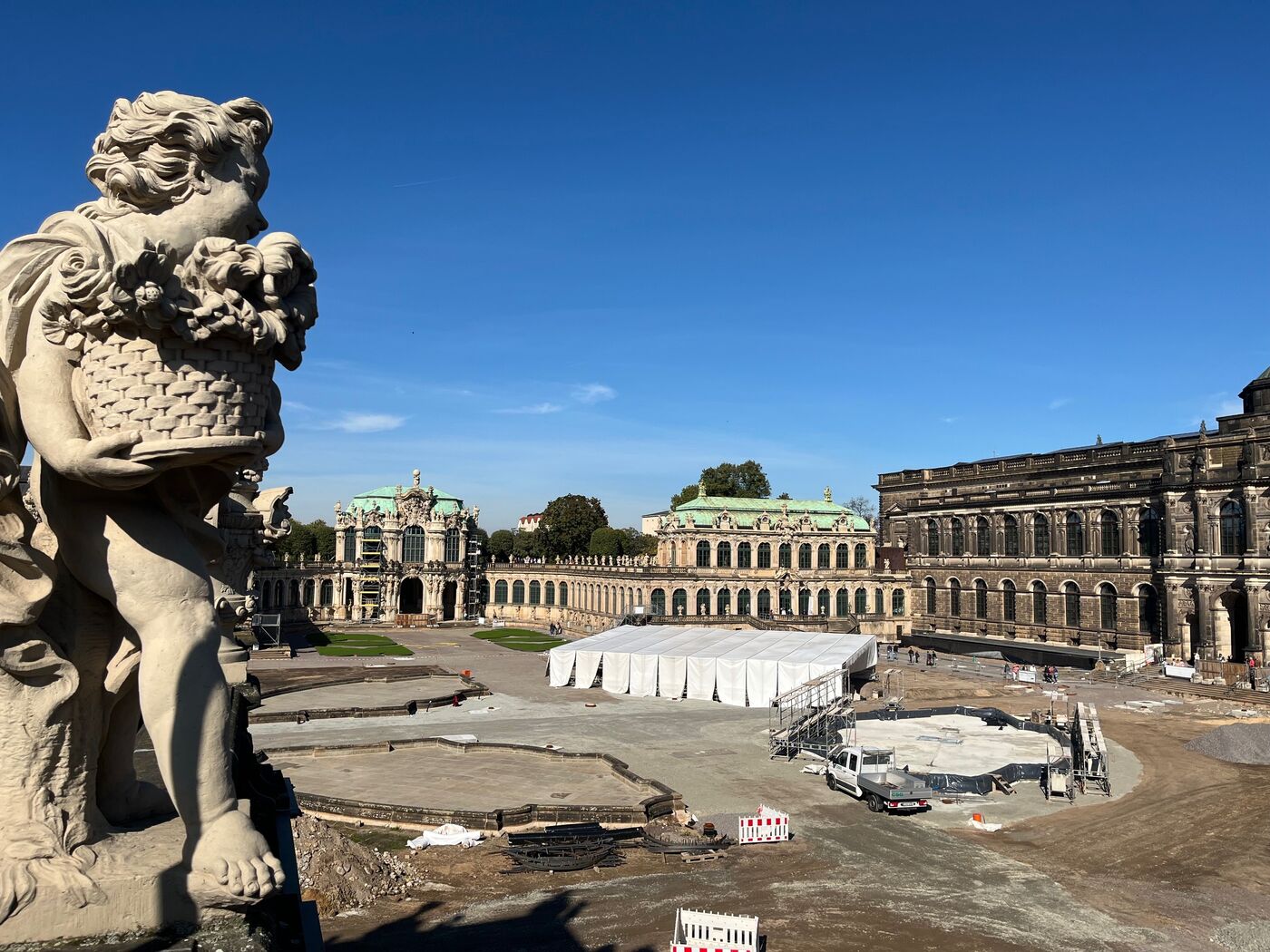 „Es ist die erste Generalsanierung des Zwinger-Hofes seit dem Wiederaufbau nach Kriegsende. Nun ist der Zwinger keine normale Baustelle. Wir mussten erschütterungsarm arbeiten (wegen der fragilen Schätze im Zwinger selbst, d.R.), den Besucherverkehr weiter aufrecht erhalten. Und außerdem hatten wir uns zu Beginn der Bauarbeiten dann entschlossen, die Springbrunnen noch zu sanieren.Das hat sich schwieriger gestaltet als gedacht“, erklärt Joachim Thäle vom Sächsischen Immobilien- und Baumanagement. Deshalb musste nachfolgende Gewerke auch warten.