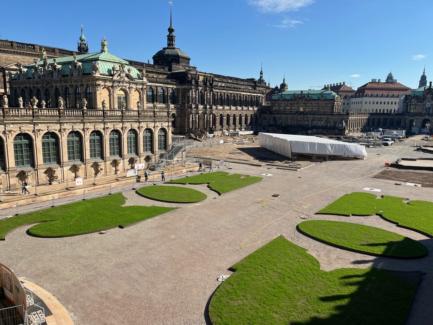 Vor einem Jahr konnte dann der erste Rasen wieder im Innenhof angesät werden, der nun mittlerweile wieder üppig sprießt. Der Rasen unterhalb des Wallpavillons ist ganz neu - dort war zuvor nur eine leere Asche-Fläche für Tribünen und Veranstaltungen. “Die Rasenbeete sind denen unterhalb des Glocken-Pavillons gespiegelt wurden„, so Marcus Plötz, der zuständige Gärtner für den Zwinger. Im Frühjahr werden dann auch wieder die 100 Orangenbäumchen in den Zwinger Einzug halten und an die ursprüngliche Nutzung des Hofes erinnern. Dort standen unter August dem Starken rund 1000 Orangenbäume.