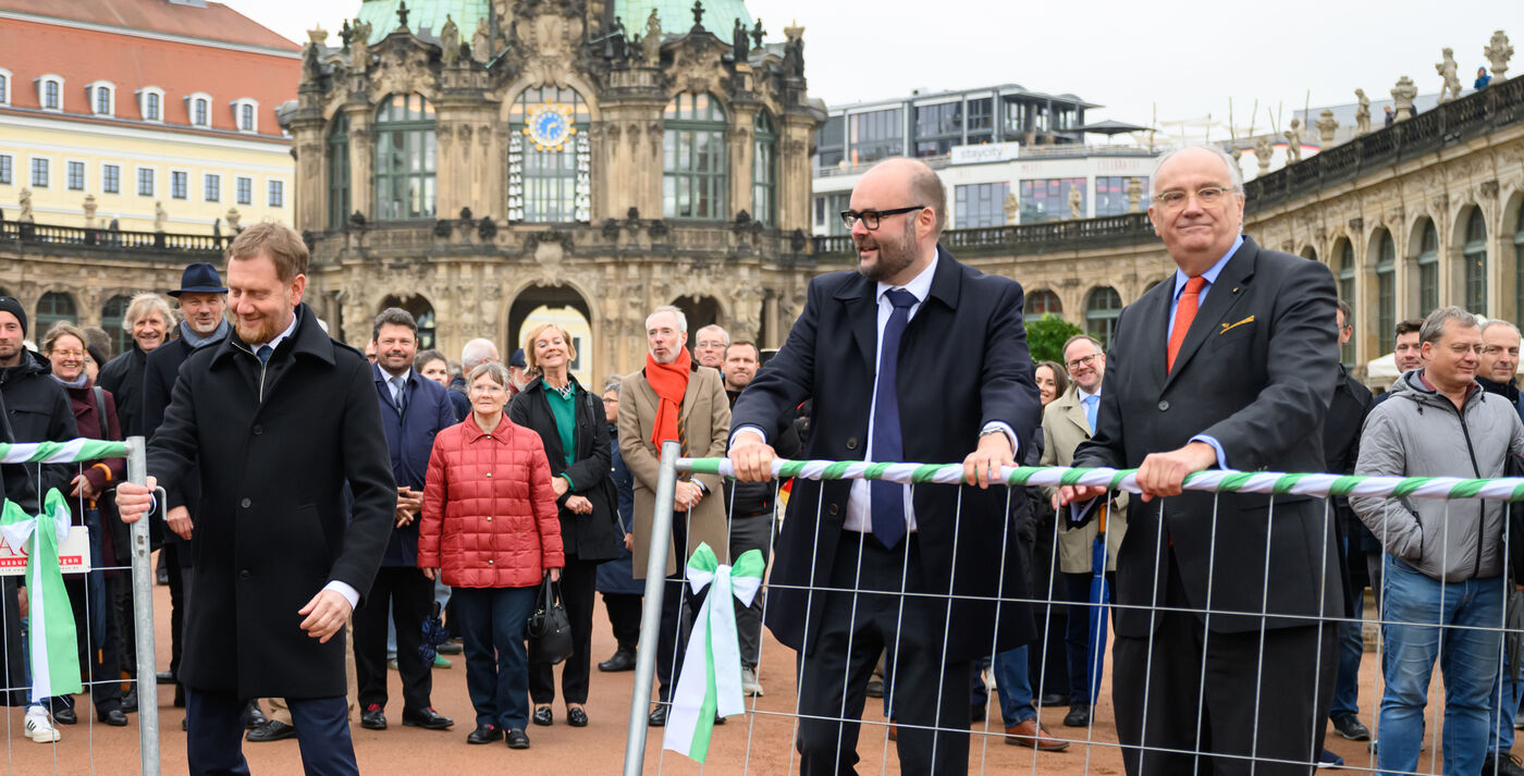 • Ministerpräsident Kretschmer, Finanzminister Piwarz und Sachsens Schlösser-Chef Striefler (v.l.n.r.) öffneten am Dienstag den letzten Bauzaun