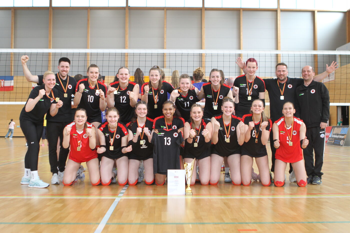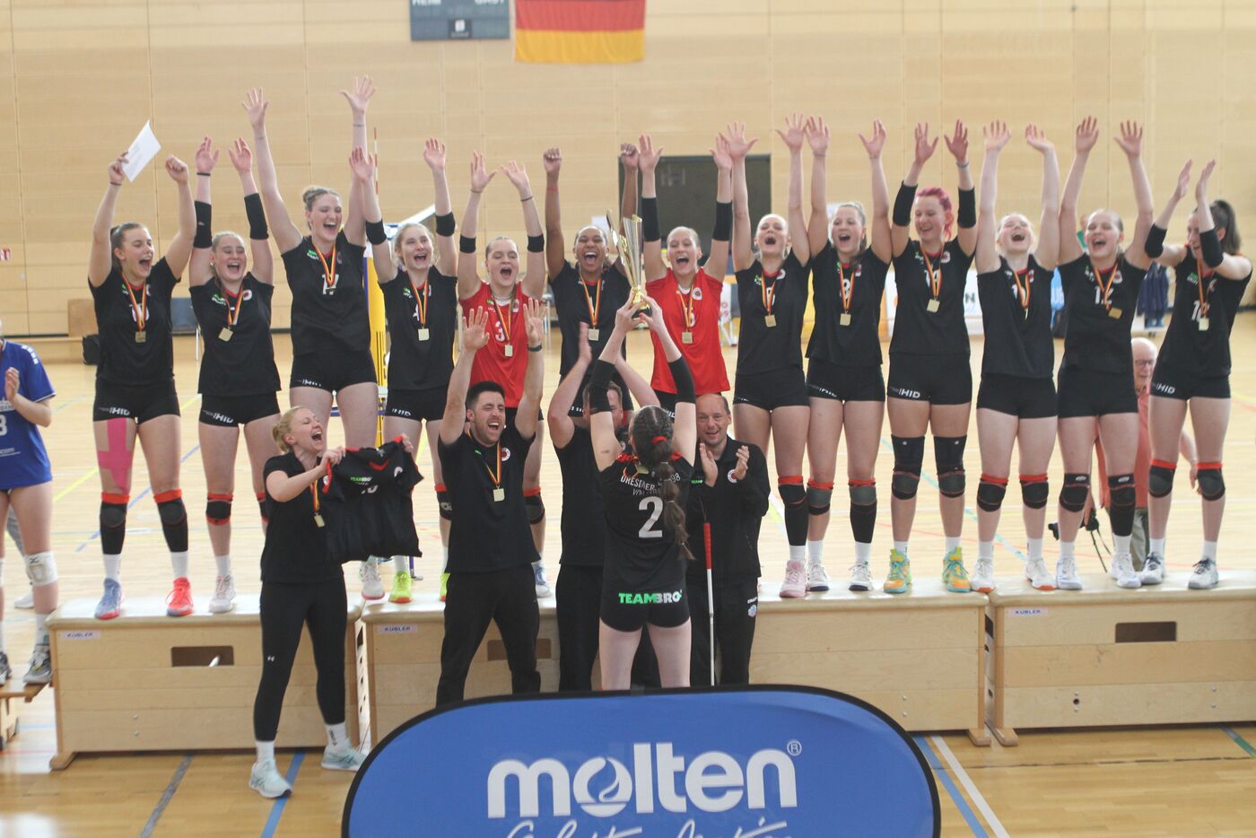 Die U-20 Volleyballerinnen des Dresdner SC sind deutscher Meister. Das Team von VC Olympia Trainer Andreas Renneberg setzte sich in Saarbrücken am Sonntag, den 11.05.2025 im Finale gegen den VC Wiesbaden durch. Der DSC Nachwuchs gewann das Spiel mit 2:1 Sätzen (24:26, 25:15, 15:10).