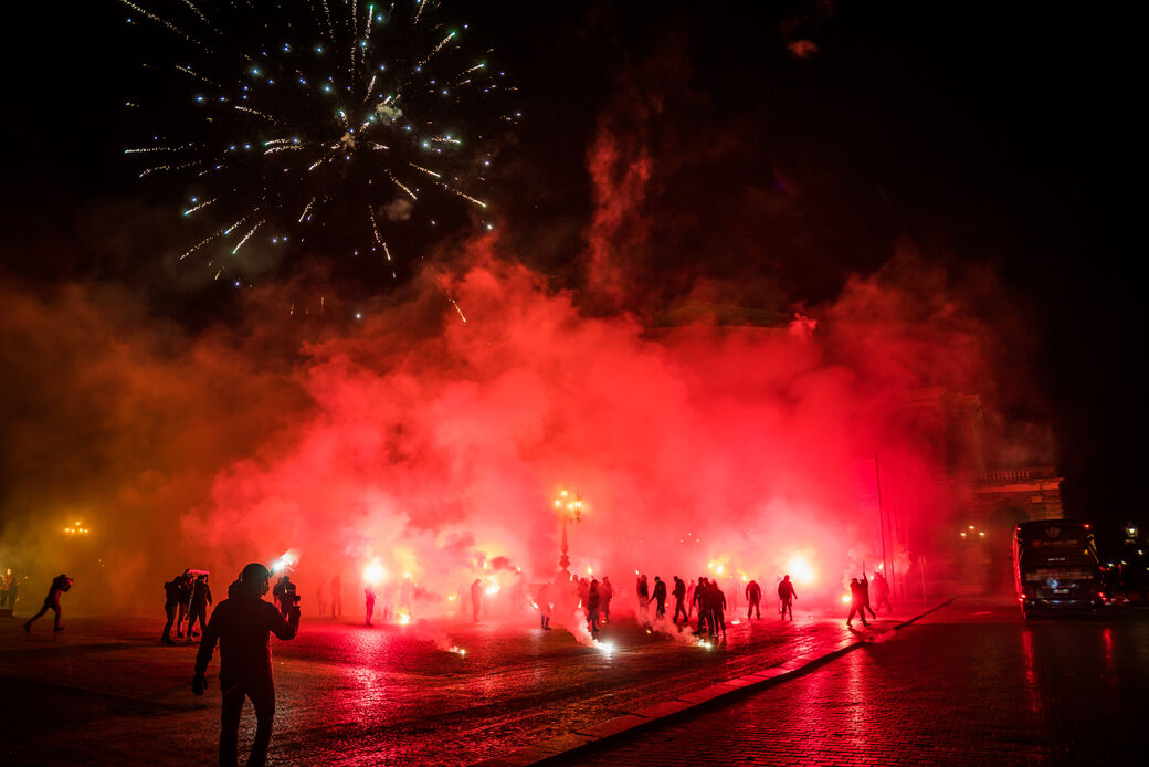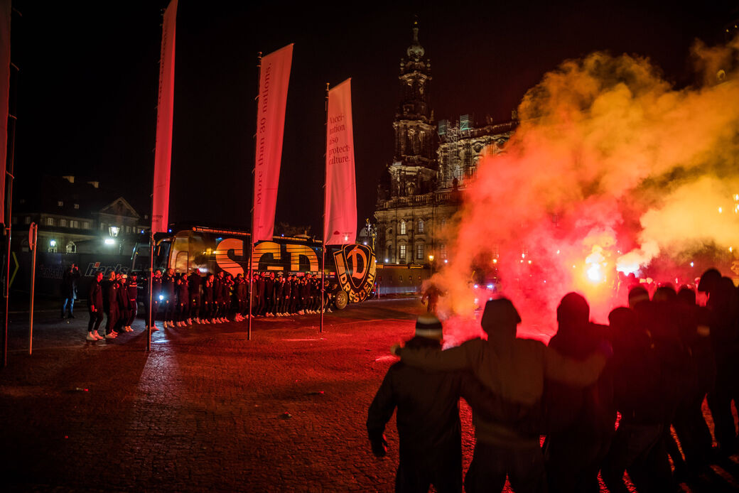 Augenzeugen berichteten, der Mannschaftsbus habe gezielt den Theaterplatz vor der Semperoper angesteuert. Dort sei eine nicht unerhebliche Zahl von Anhängern plötzlich aus allen Richtungen zusammengeströmt, hätten Bengalos, Knaller und Raketen gezündet.