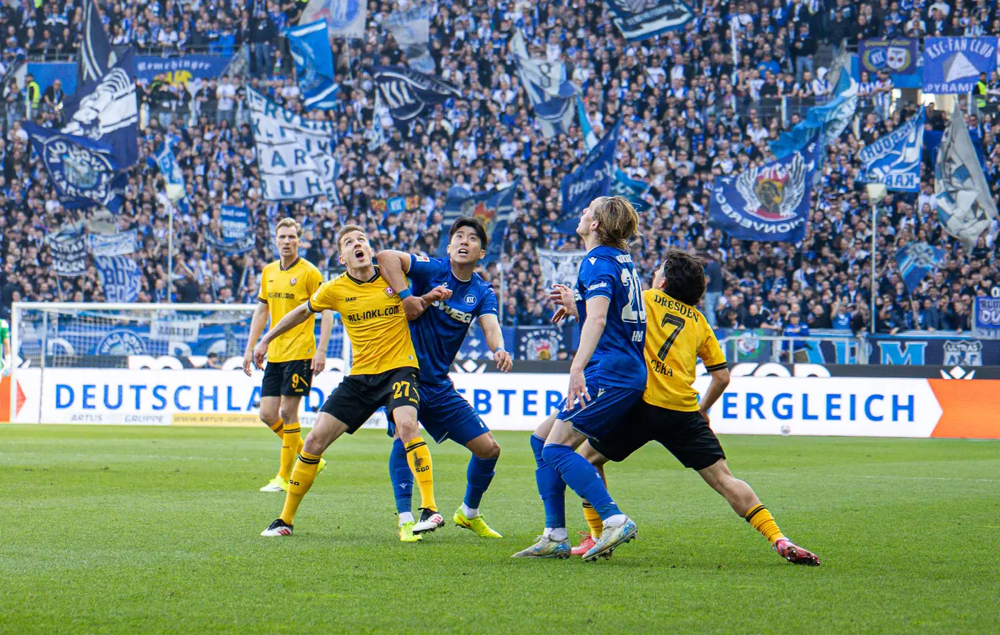 Dynamo startete stark in die Partie. Niklas Hauptmann brachte die Gäste bereits in der 4. Minute in Führung. Karlsruhe glich durch einen Foulelfmeter von Marvin Wanitzek aus (23.). Dresden antwortete schnell: Ben Bobzien traf nach Vorarbeit von Jason Ceka zum 2:1 (30.). Kurz vor der Pause erhöhte Hauptmann mit einem sehenswerten Doppelpass mit Vermeij auf 3:1 (44.).