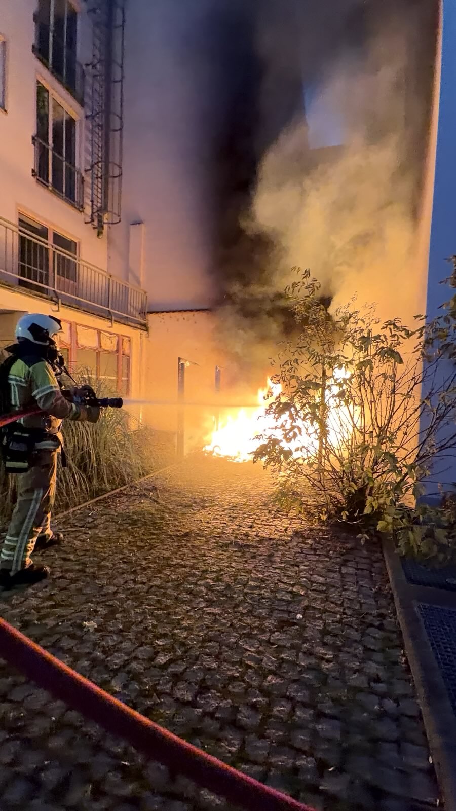 Zwei angrenzende Gebäudefassaden wurden durch die Flammen in Mitleidenschaft gezogen, Fensterscheiben im Erdgeschoss wurden beschädigt. Die Räume selbst blieben unversehrt, und es drang kein Rauch in die Innenräume ein.