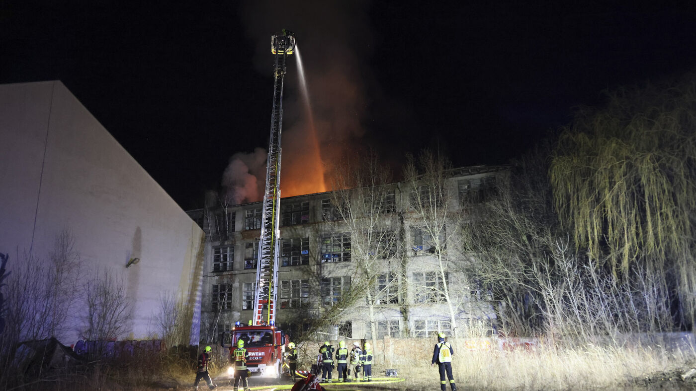 - Das Dach der ehemaligen Wanderer-Werke stand in Flammen. Die Feuerwehr löschte zunächst über eine Drehleiter von außen.