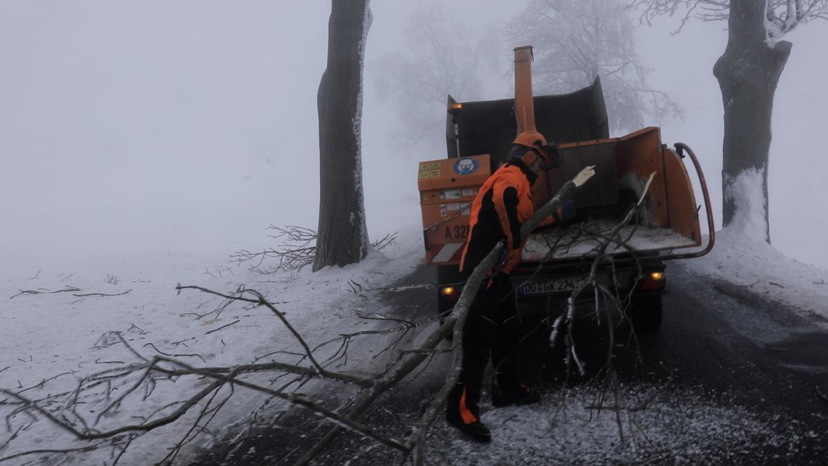 Forstarbeiter haben mit Frostbruch im Erzgebirge zu tun