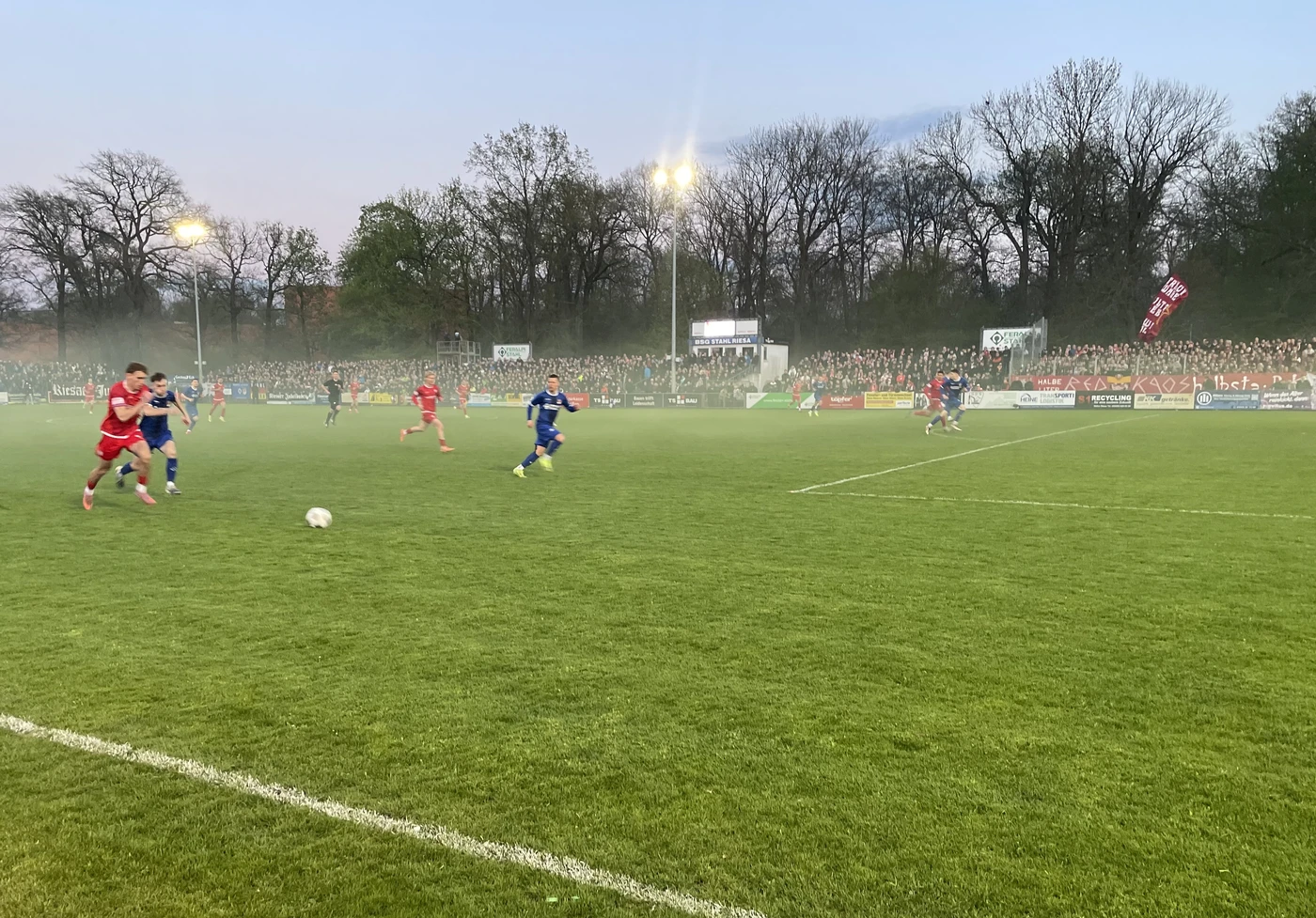 Die Schwäne begannen druckvoll vor vollen Rängen in der Feralpi-Arena. Riesa verteidigte mutig und aggressiv, kam aber kaum zu Entlastung. In der 19. Minute prüfte Lennert Möbius Riesas Keeper Christopher Hauswald erstmals aus acht Metern.  In der 23. Minute fiel die Führung: Veron Dobruna flankte von links. Im Fünfmeterraum war Cemal Sezer cleverer als Dennis Leonhardt und köpfte aus vier Metern problemlos ein. Kurz vor der Pause hatte Vladyslav Skala die beste Riesaer Chance – er zielte im Fallen nur haarscharf vorbei.