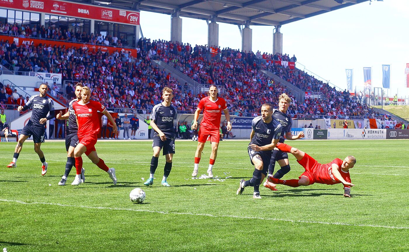 Der FSV erwischte einen guten Start und sorgte in der fünften Minute direkt für eine Szene, die in jedem Saisonrückblick zu sehen sein wird. Erst scheiterten Lucas Albert und Veron Dobruna insgesamt drei Mal am Aluminium, der Nachschuss von Jahn Herrmann wurde dann kurz vor der Linie geblockt. Alle im Stadion - wohl auch die Gästefans - konnten nicht ganz glauben, was sie da gerade gesehen hatten. Und es ging direkt weiter: Die darauffolgende Ecke führte zum Tor - aber für Leipzig. Am Ende eines gut ausgespielten Konters kappte Janik Mäder im Strafraum nach innen und schlenzte den Ball ins lange Eck.