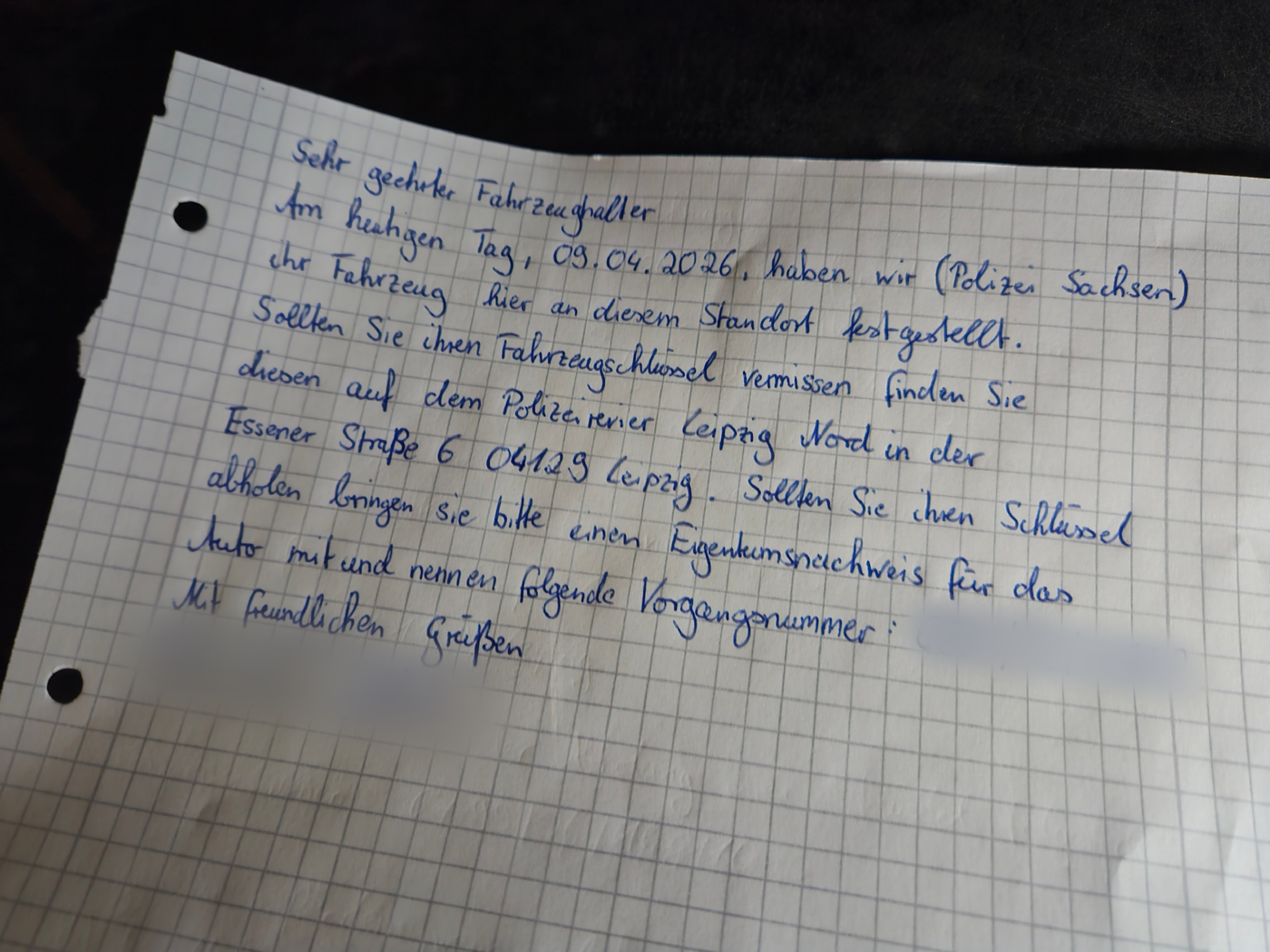 Daher haben die Polizisten den Schlüssel an sich genommen und dem Fahrzeughalter einen freundlichen Brief hinterlassen: Er könne sich den Schlüssel unter Vorlage eines Eigentum-Nachweises im Revier abholen.