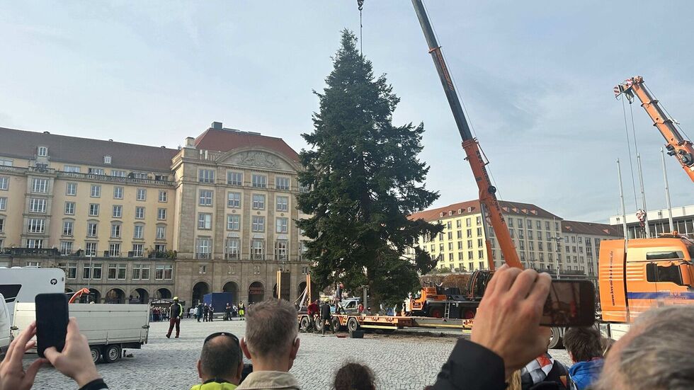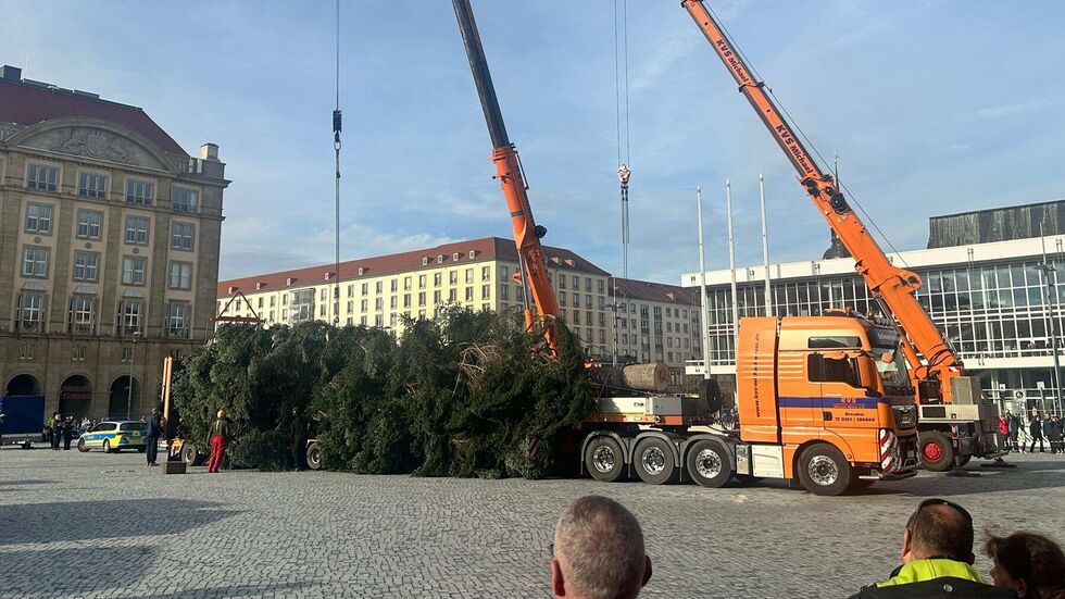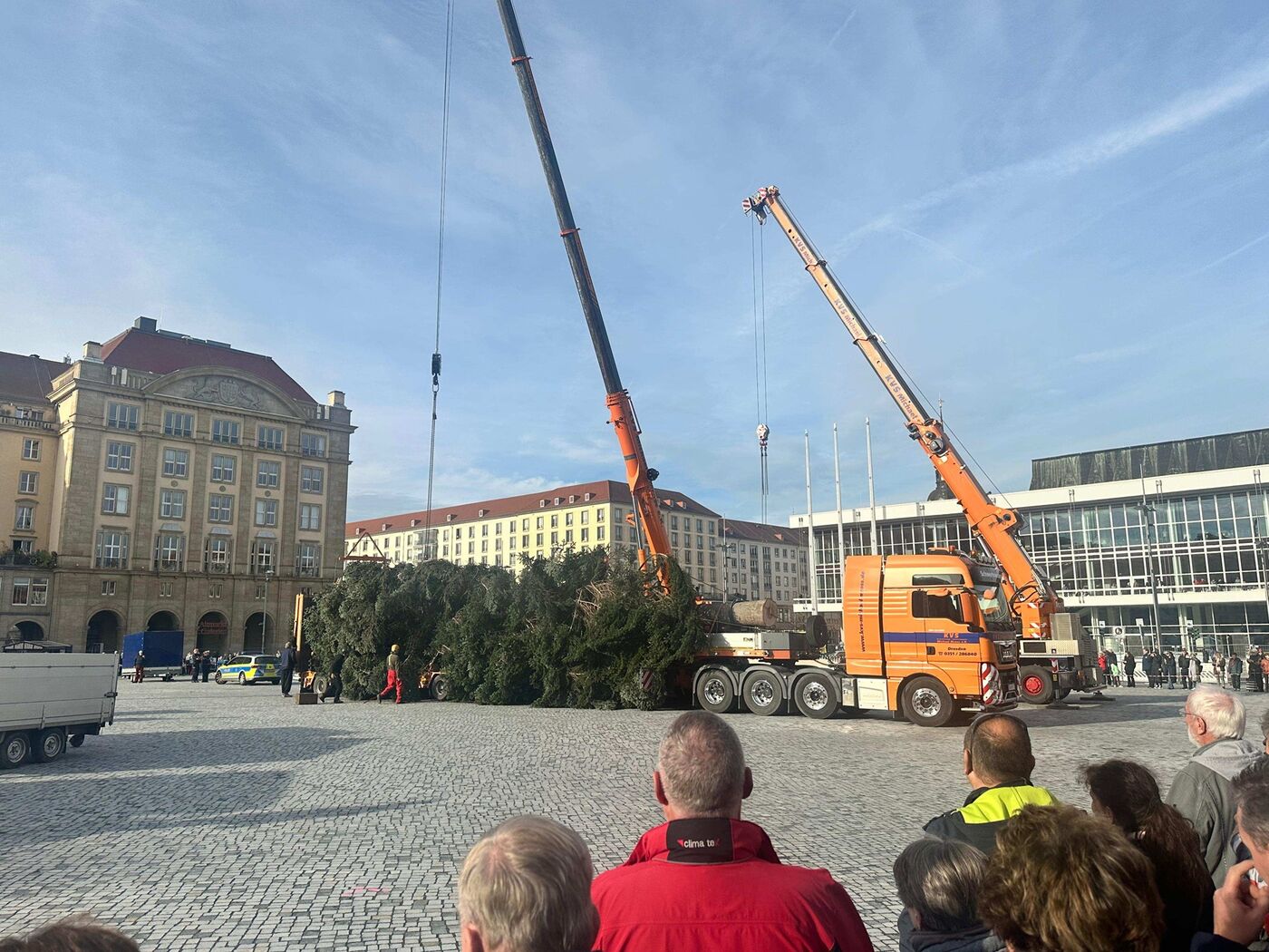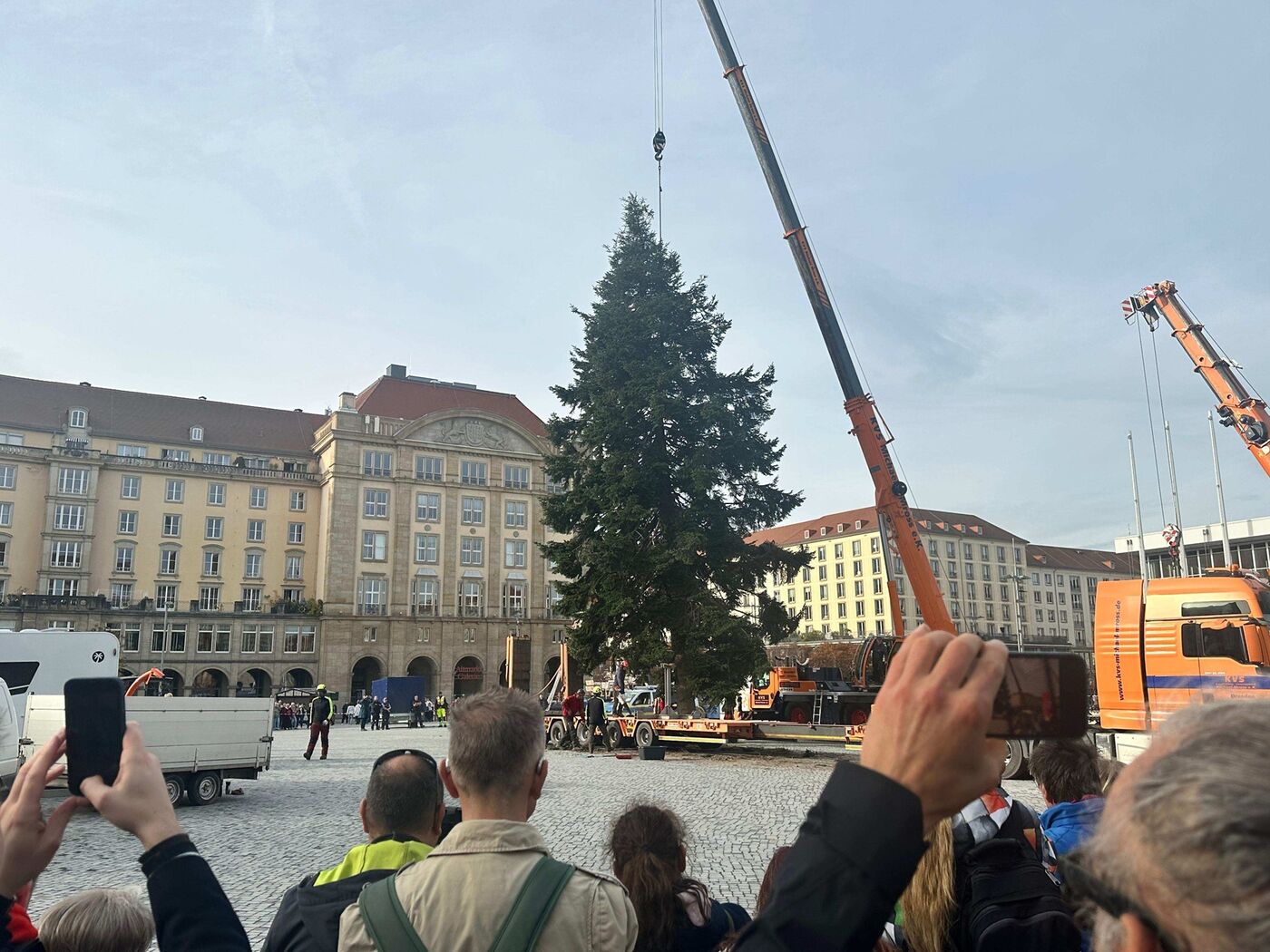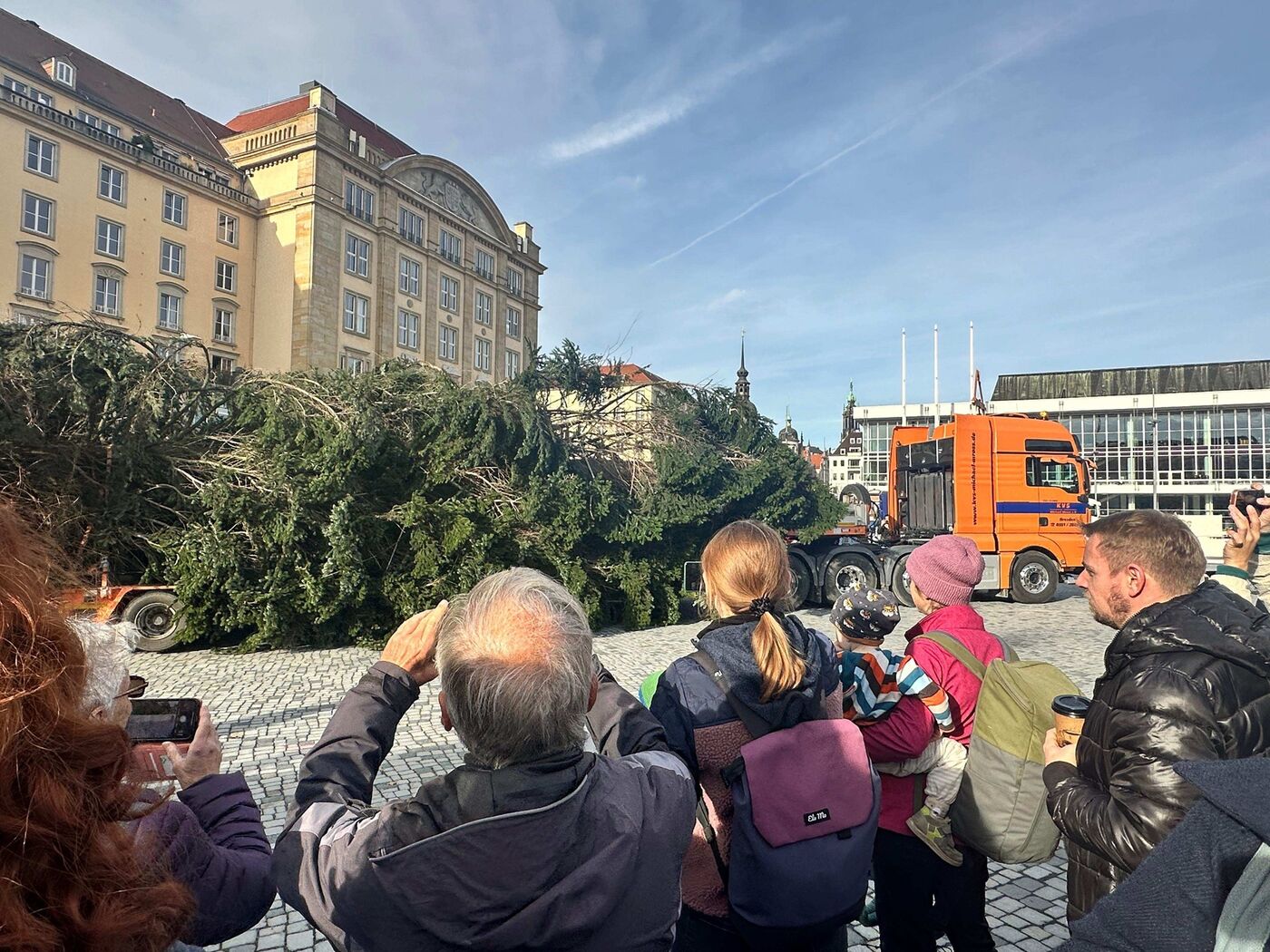 Hunderte Schaulustige versammelten sich auf dem Altmarkt, um das Spektakel zu verfolgen. Eigentlich sollte der Baum zwischen 10 und 11 Uhr eintreffen. Es gab allerdings ein paar Hindernisse auf dem Weg, unter anderem ein falschparkendes Auto. Das Fahrzeug musste erst weggefahren werden.