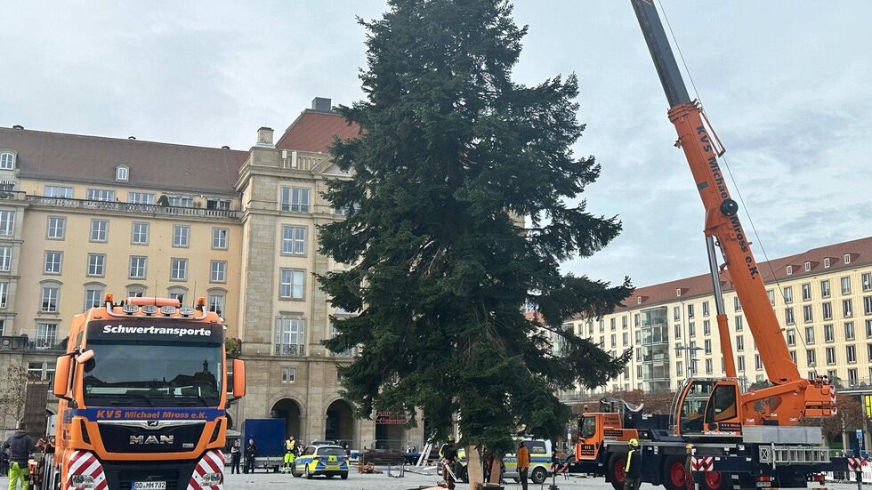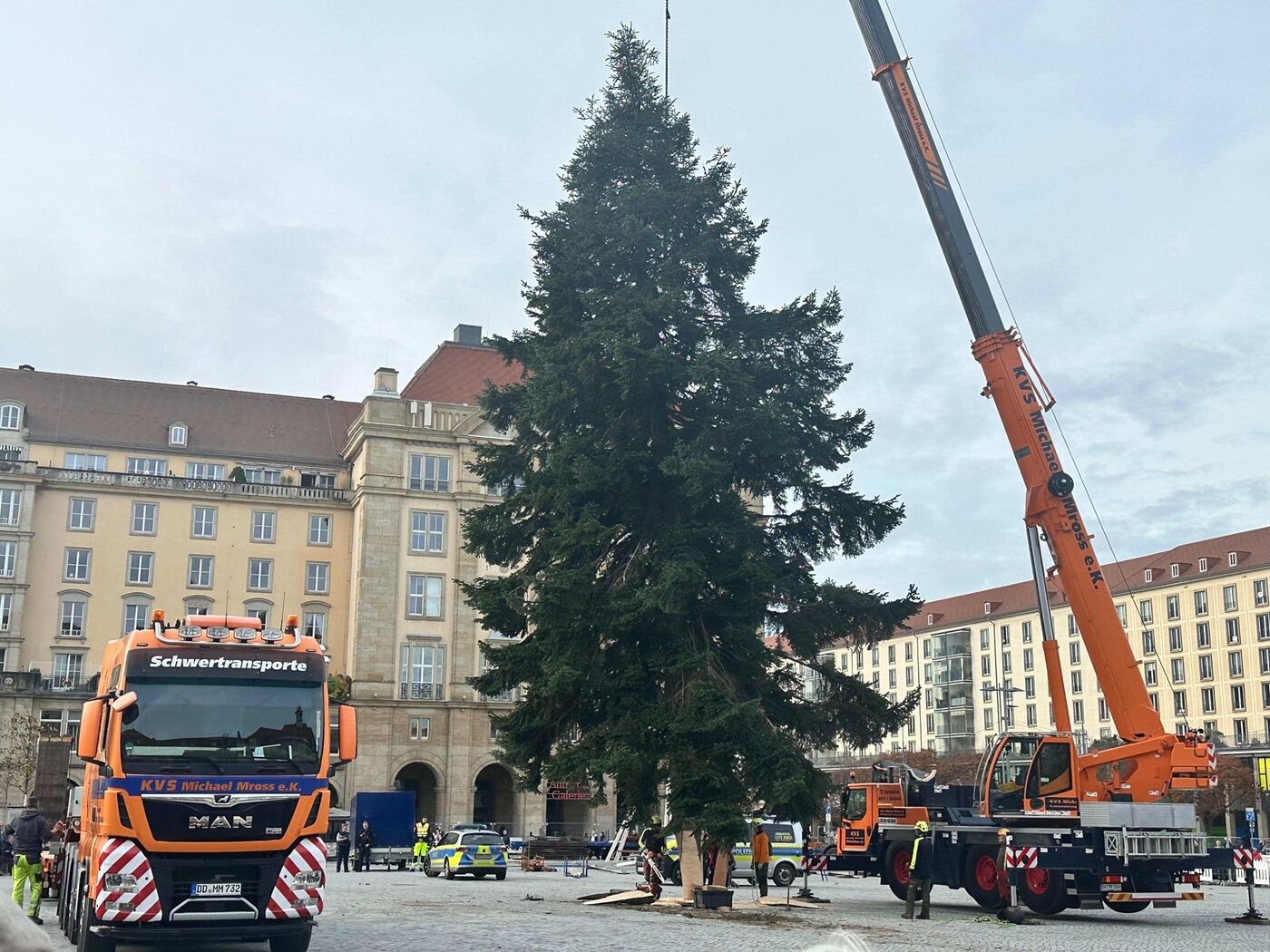 Dresden hat seinen Baum für den 591. Striezelmarkt! Mit dreistündiger Verspätung ist die Striezelmarkt-Tanne am Samstag gegen 13:30 Uhr im Dresdner Zentrum angekommen.