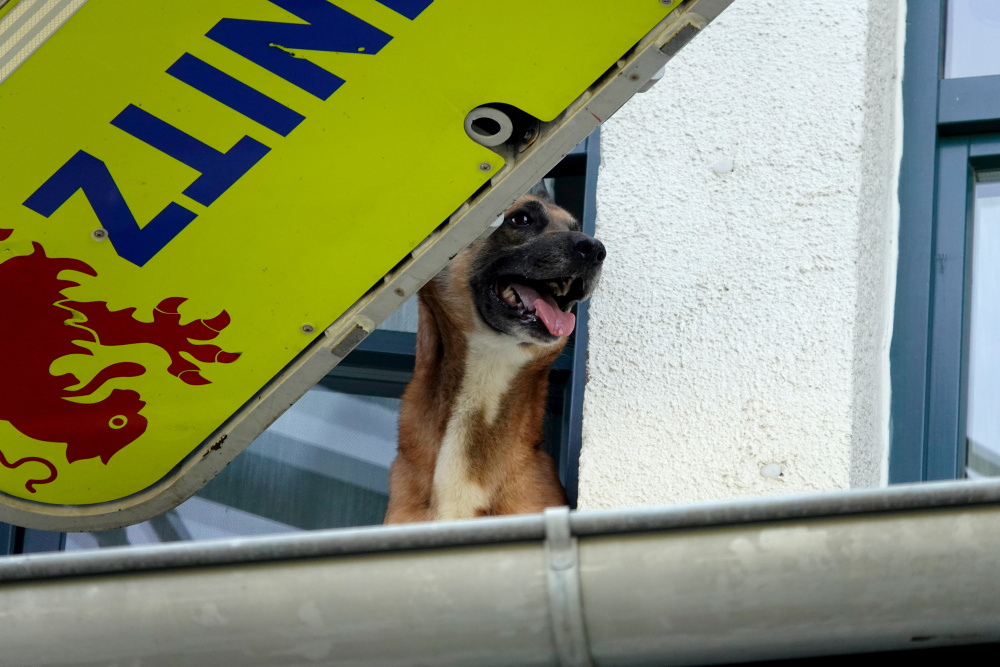 - Der Hund war aus einem Fenster auf das Vordach geklettert.