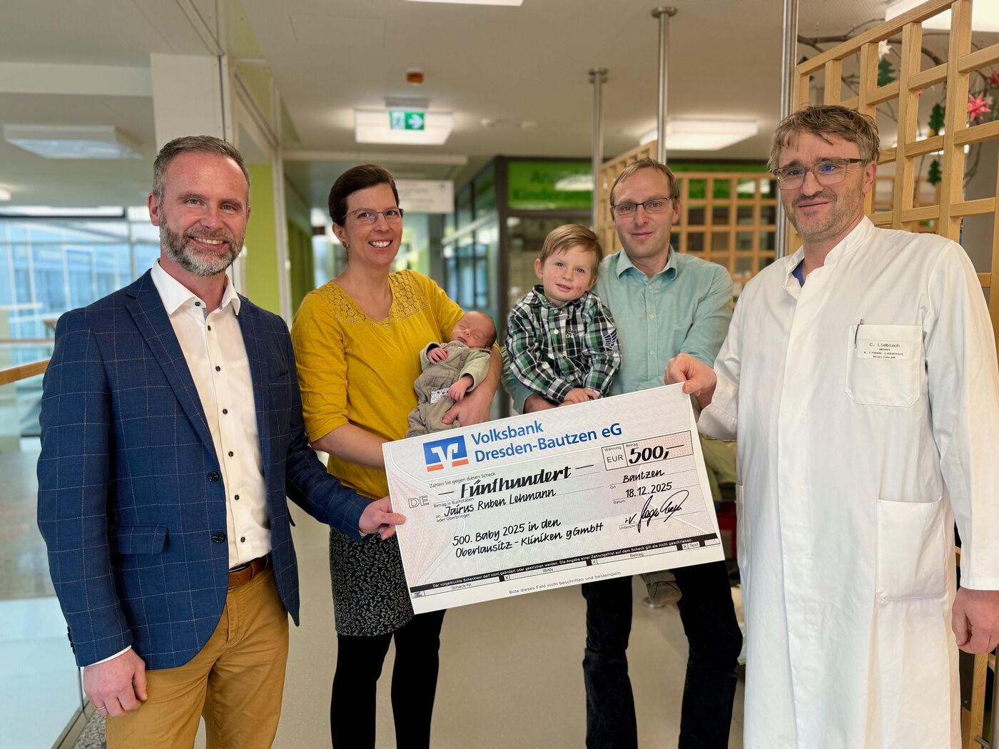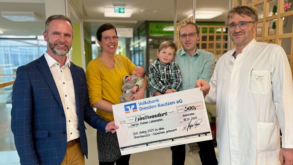 Jairus Ruben – so heißt das 500. in diesem Jahr im Krankenhaus Bautzen geborene Kind. Sein Startgewicht  betrug 2.640 Gramm, die Startlänge 47 Zentimeter. Für Mutter Annegret und Vater Marco ist es schon die vierte Geburt in Bautzen. Von der Volksbank Dresden-Bautzen gab es 500 Euro als Starthilfe.