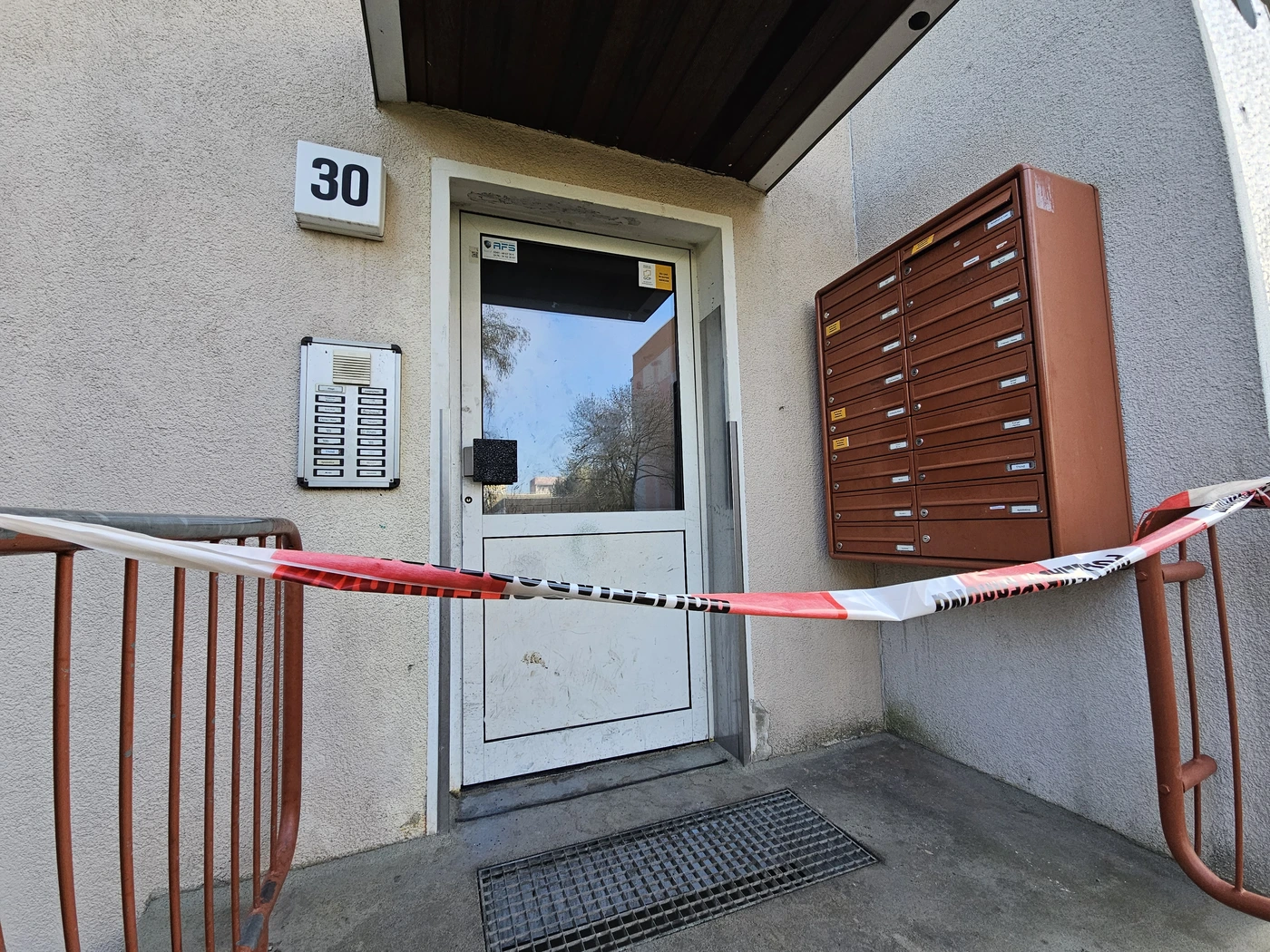 - Die Polizei hat den Eingang zu dem Mehrfamilienhaus abgesperrt.