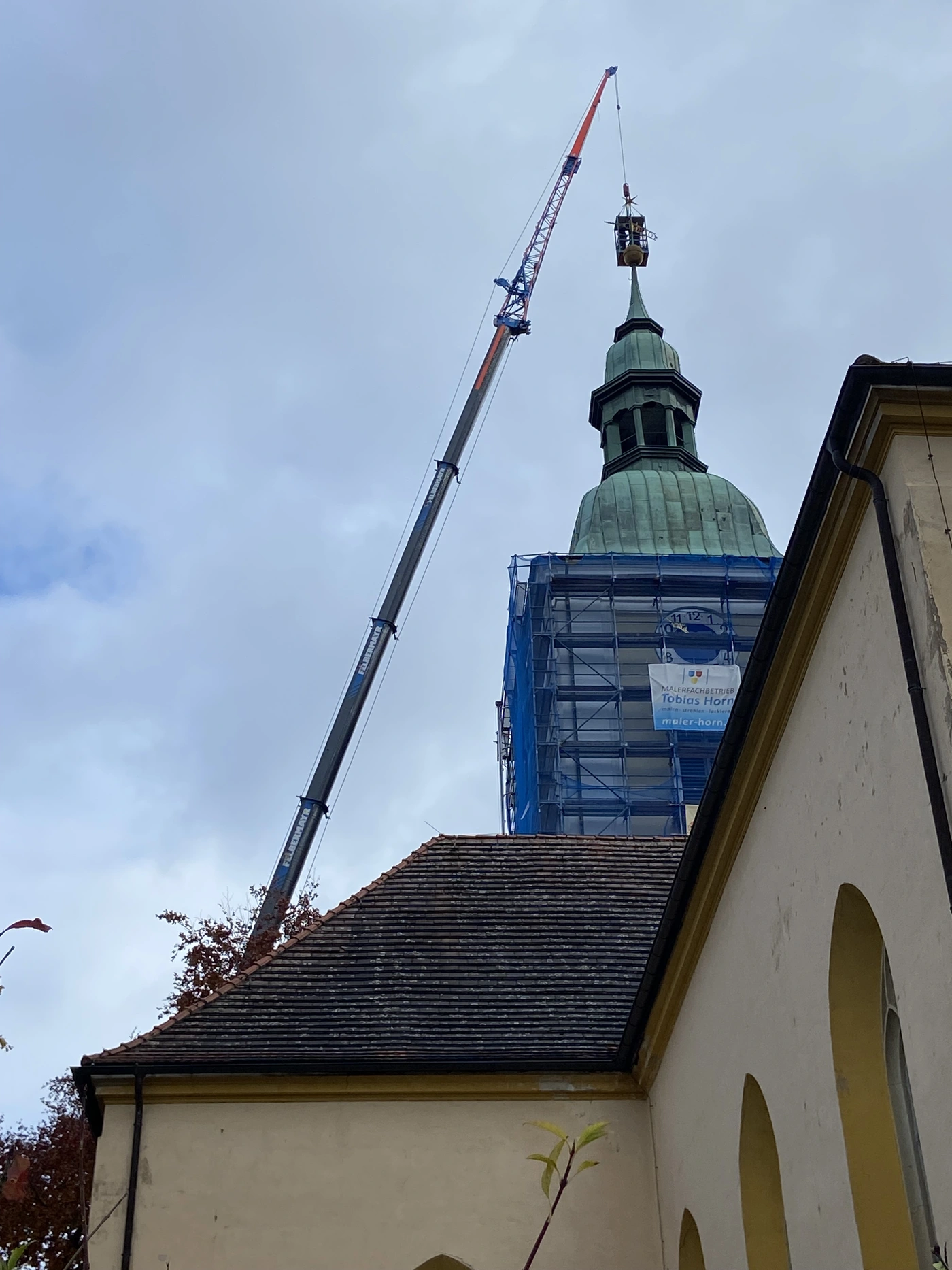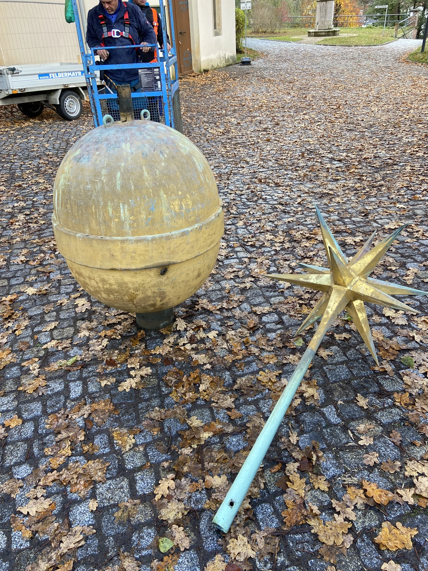 Die Kirche in Bernstadt auf dem Eigen bekommt ihren Kopfschmuck zurück. Stern, Wetterfahne und Kugel werden heute wieder auf die Spitze gesetzt. Sie waren im November abgenommen und anschließend instandgesetzt und restauriert worden. In der der Kugel befinden sich nun drei Hülsen mit Zeitdokumenten.
