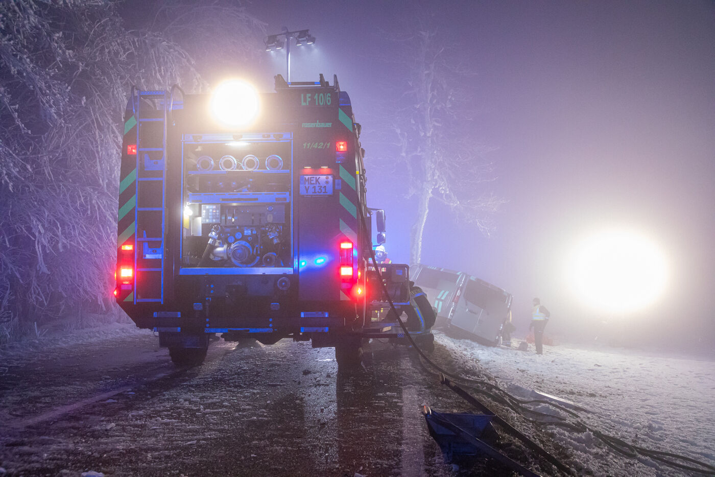Laut unserem Reporter vor Ort kam der Fahrer eines vollbesetzten Kleinbusses im dichten Nebel und auf spiegelglatter Fahrbahn von der Straße ab und prallte frontal gegen einen Baum. Wie Einsatzleiter Michael Rothe von der Feuerwehr Satzung mitteilte, wurde beim Eintreffen der Rettungskräfte ein Massenanfall an Verletzten festgestellt. Die Verletzten wurden in umliegende Krankenhäuser gebracht.