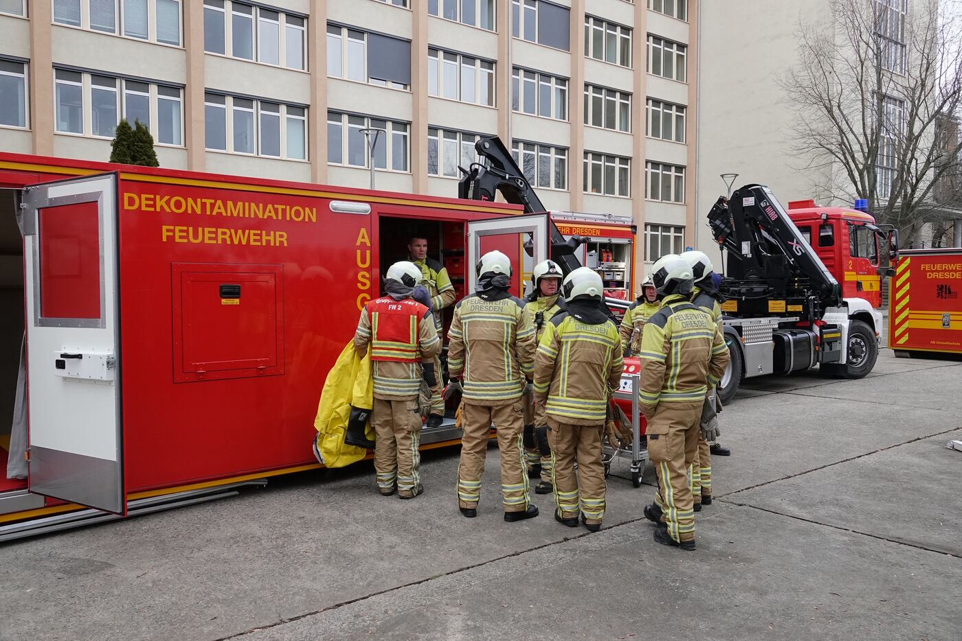 ABC-Alarm in Dresden-Klotzsche. Bei Arbeiten in einem Bildungsinstitut ist ein gefährlicher Stoff ausgetreten. Am Donnerstagmittag rückten 50 Feuerwehrleute an und evakuierten das Gebäude.