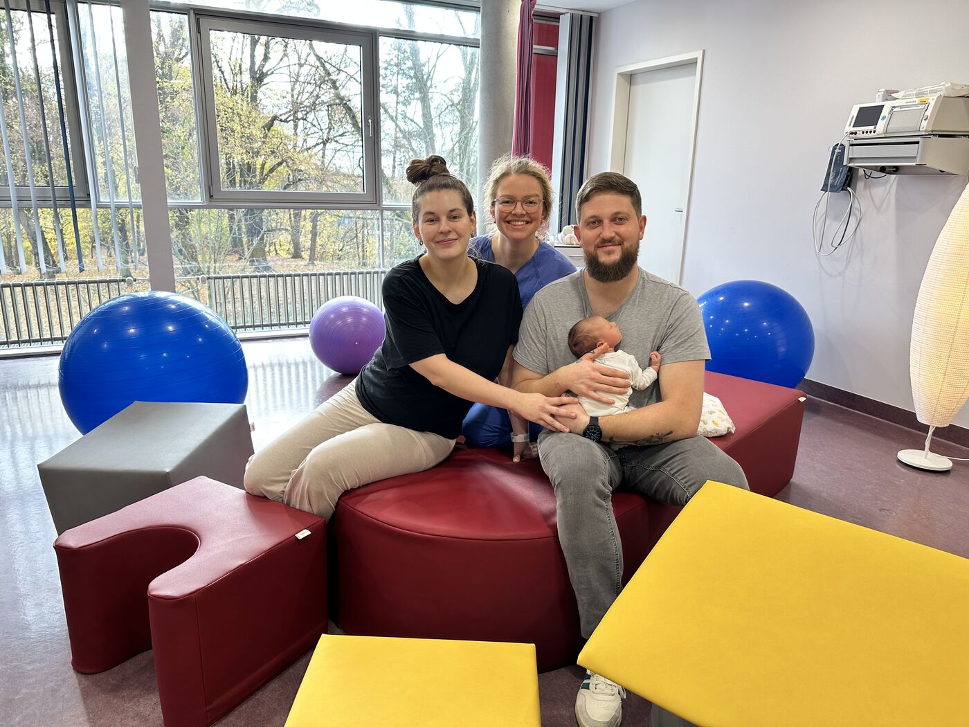 - Die ersten, die am 08. November mit den neuen Modulen entbunden haben: Johanna M. und Tom K. mit Tochter Alma und Hebamme Sophie K.