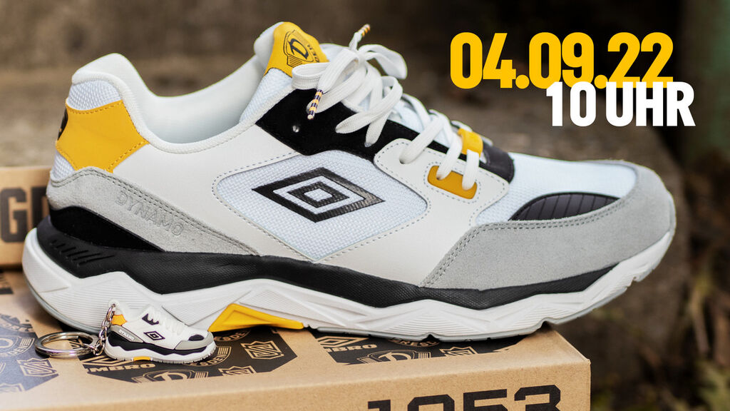 Dynamo-Fans können ihre schwarz-gelbe Liebe künftig auch am Fuß zeigen. Am Sonntag (4.9.) 10:00 Uhr ist Verkaufsstart für den Dynamo-Sneaker. Den „Umbro Stadium Runner“ im Dynamo-Design gibt es in einer limitierten Auflage von 1204 Stück. Die Zahl ist laut SGD eine Hommage an den Vereinsgeburtstag am 12. April. Weitere Info zum Schuh-Highlight der Dynamo-Geschichte will der Verein in nächsten Tagen bekanntgeben.