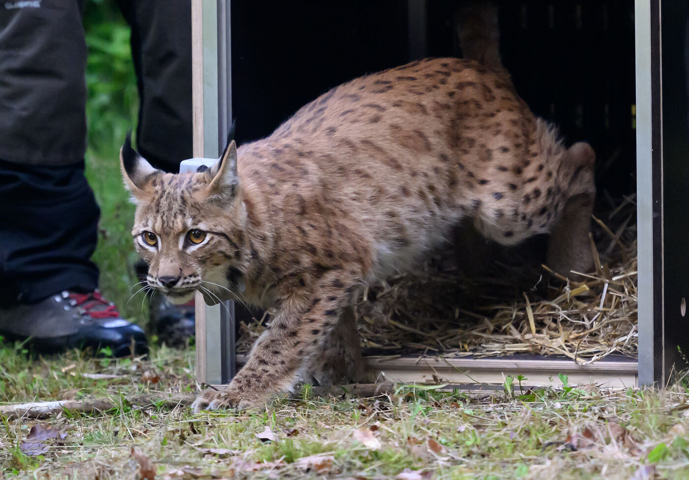- Das Luchsmännchen Charlie verlässt seine Transportbox im Forstbezirk Eibenstock.