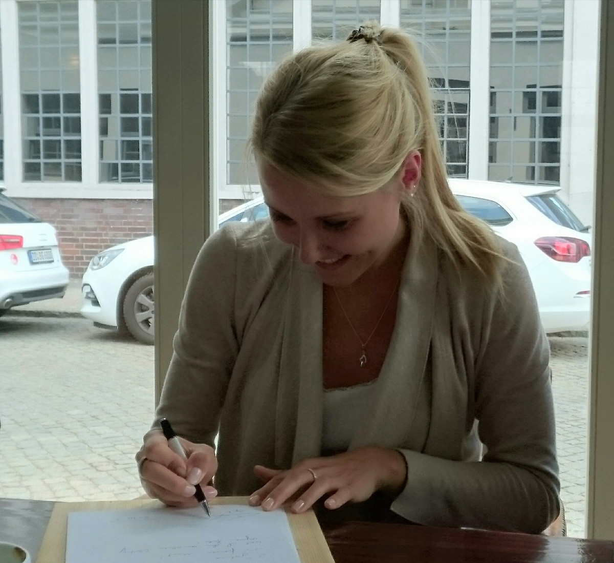 - Mareen Apitz bei der symbolischen Vertragsunterschrift (Foto: Redaktion)