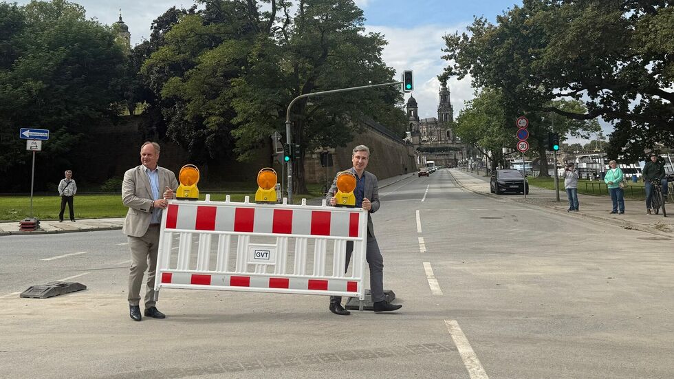 Oberbürgermeister Dirk Hilbert und Baubürgermeister Stephan Kühn ließen es sich nicht nehmen und schoben wie angekündigt Punkt 13 Uhr die letzte Absperrung selbst beiseite.