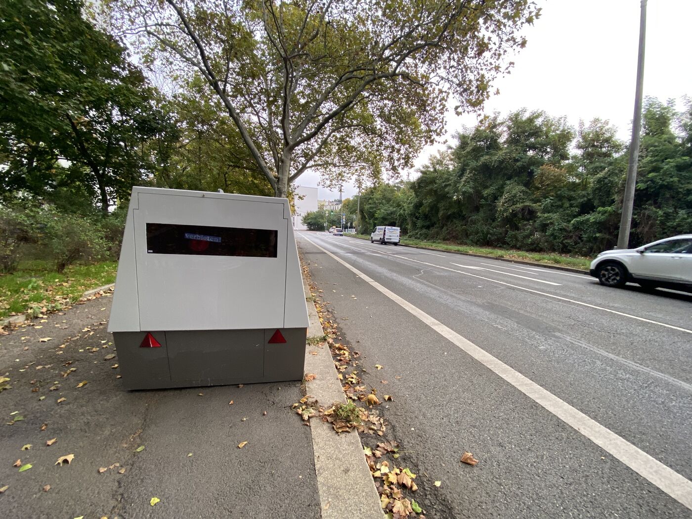 - Auf dem mobilen Blitzgerät hat jemand bereits einen Aufkleber hinterlassen.