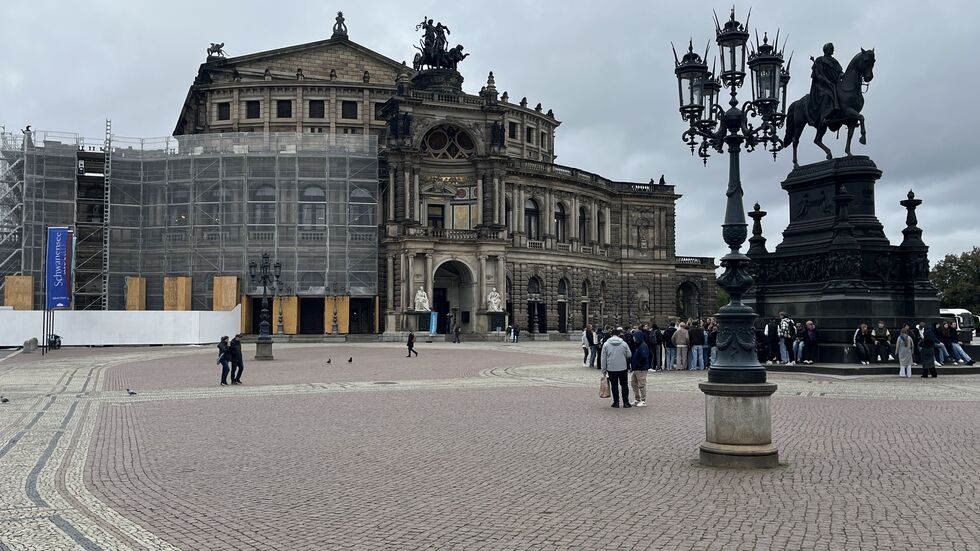 - Die Oper ist an der Seite Richtung Elbe mit Bauzäunen versperrt