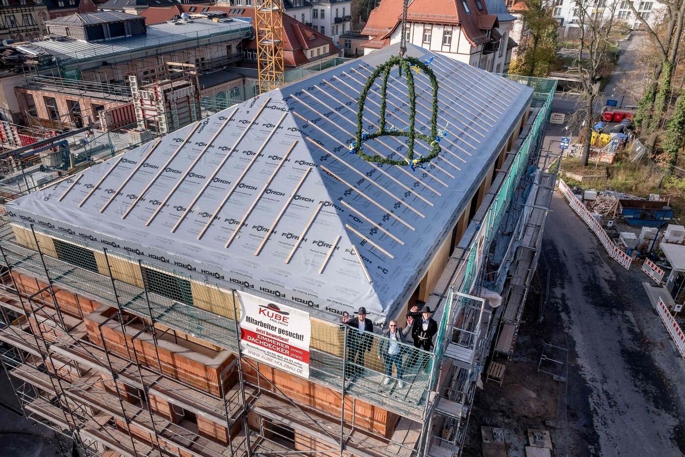 Am Dresdner Parkhotel ist der Dachstuhl der sanierten Villa Romy fertig - am Donnerstag wurde dem Bau die Richtkrone aufgesetzt. In die Räume soll künftig ein Dialysezentrum einziehen, im zweiten Obergeschoss entsteht eine Hoteletage.