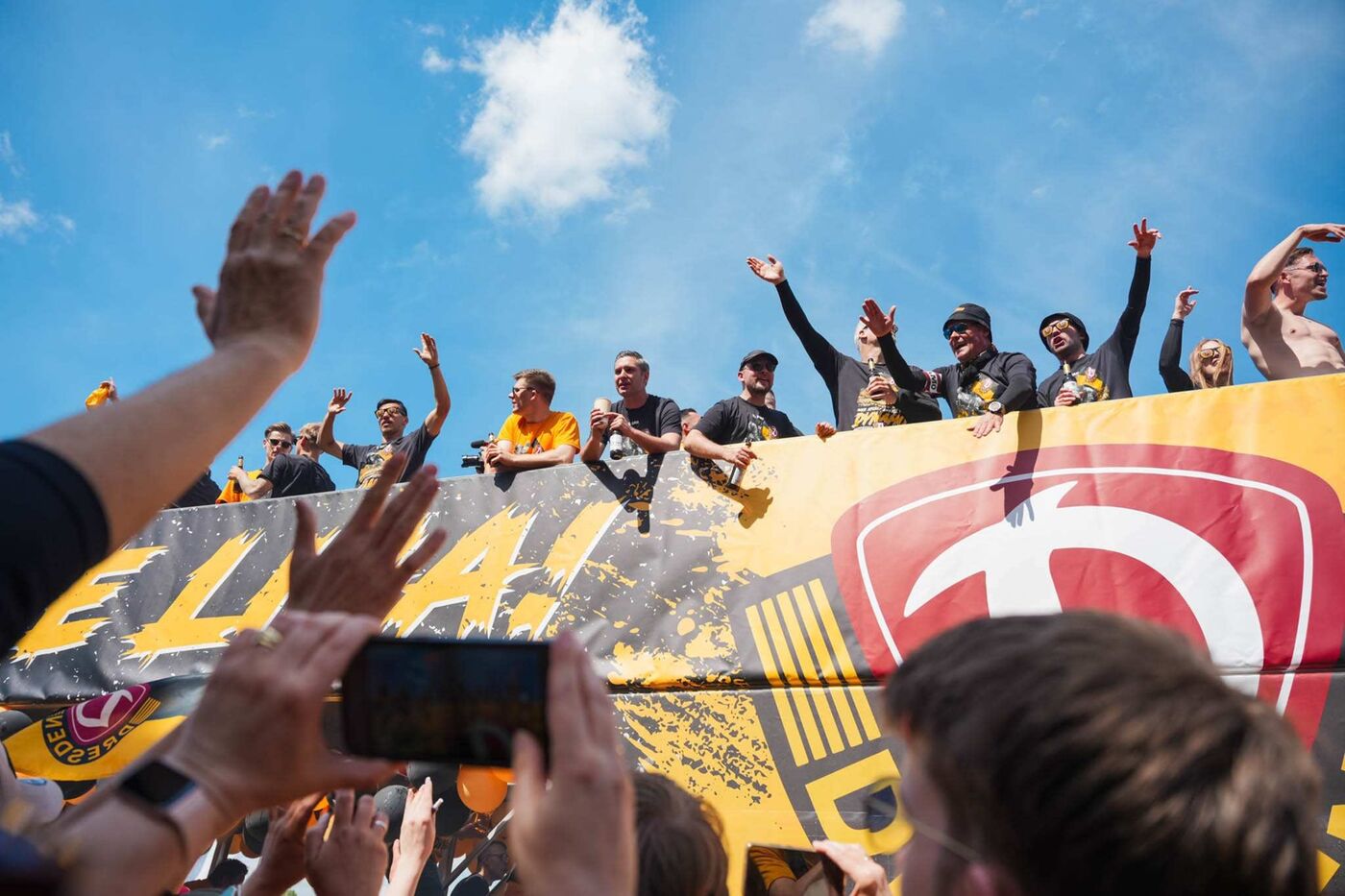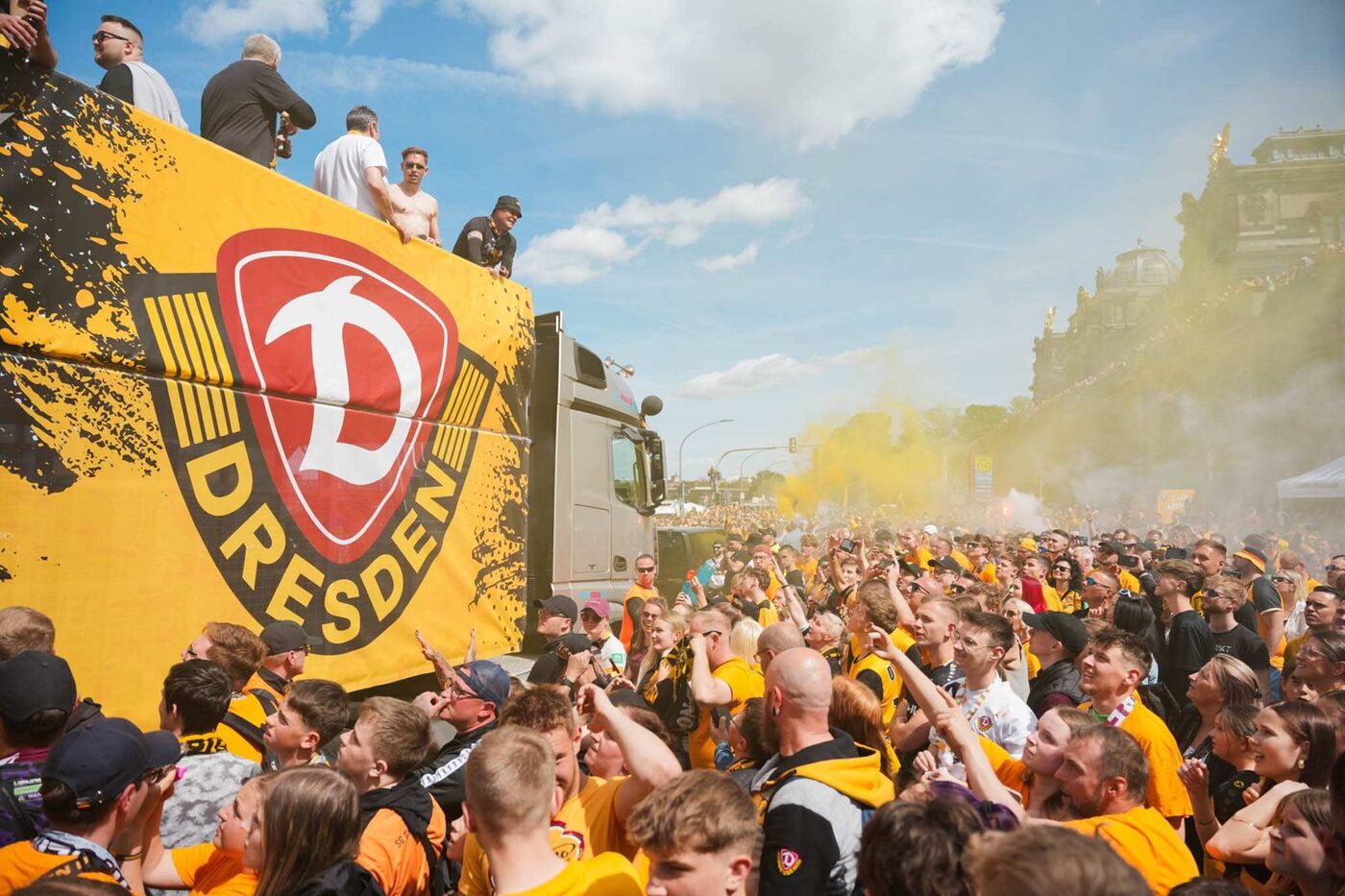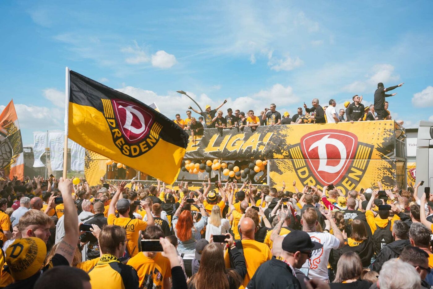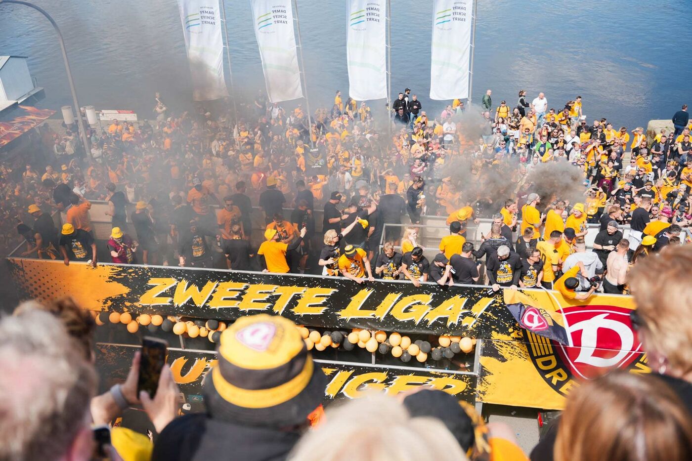 Dresden feiert seine Aufstiegshelden! Mehr als 20.000 Fans der Sportgemeinschaft haben sich am Sonntagnachmittag am Terrassenufer versammelt, um Dynamo hoch leben zu lassen.