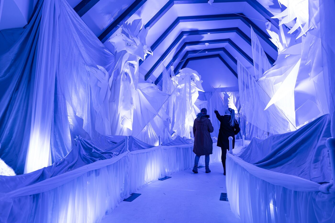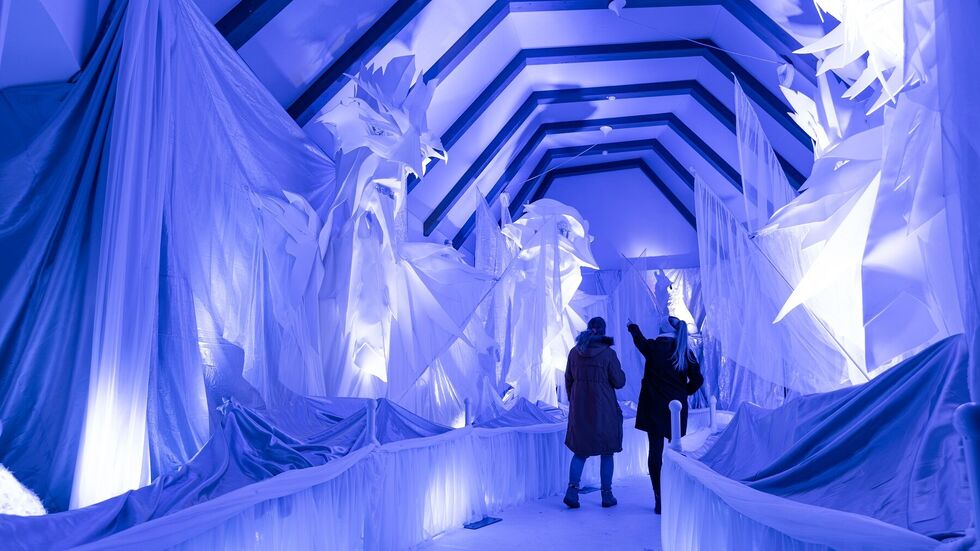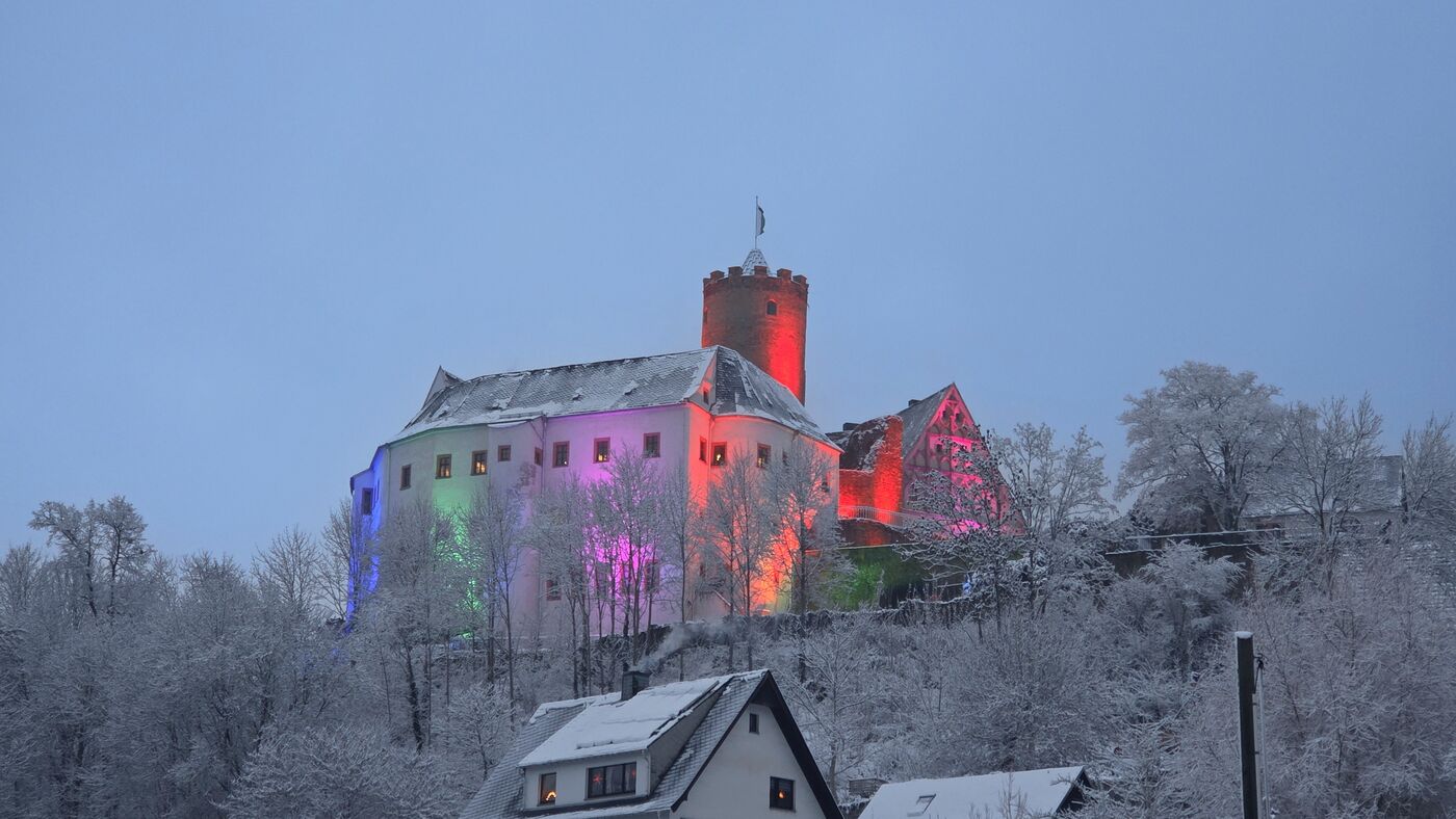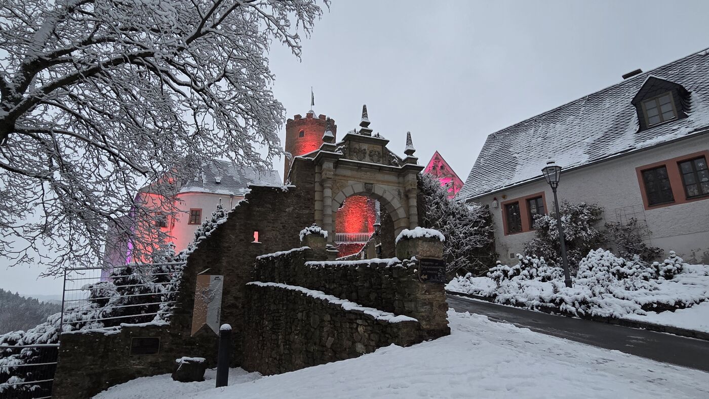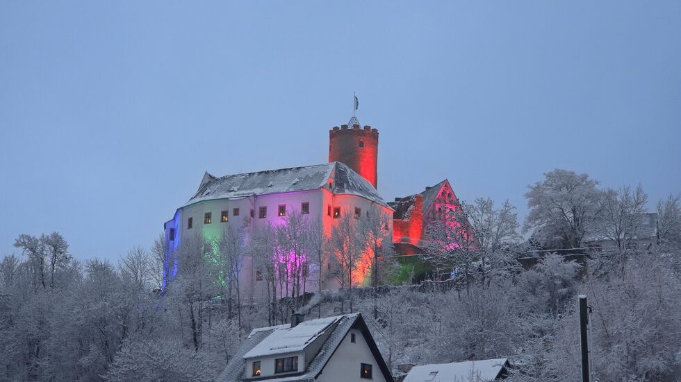 Auf Burg Scharfenstein zieht in den kommenden drei Monaten die Erlebnisausstellung „Polarzauber“ ein. Schon von weitem leuchtet die historische Anlage in den Farben der Polarlichter. Im Innern der Burg entführt die Ausstellung die Besucher in eine magische Welt, auf der Suche nach dem verschwundenen Schnee.